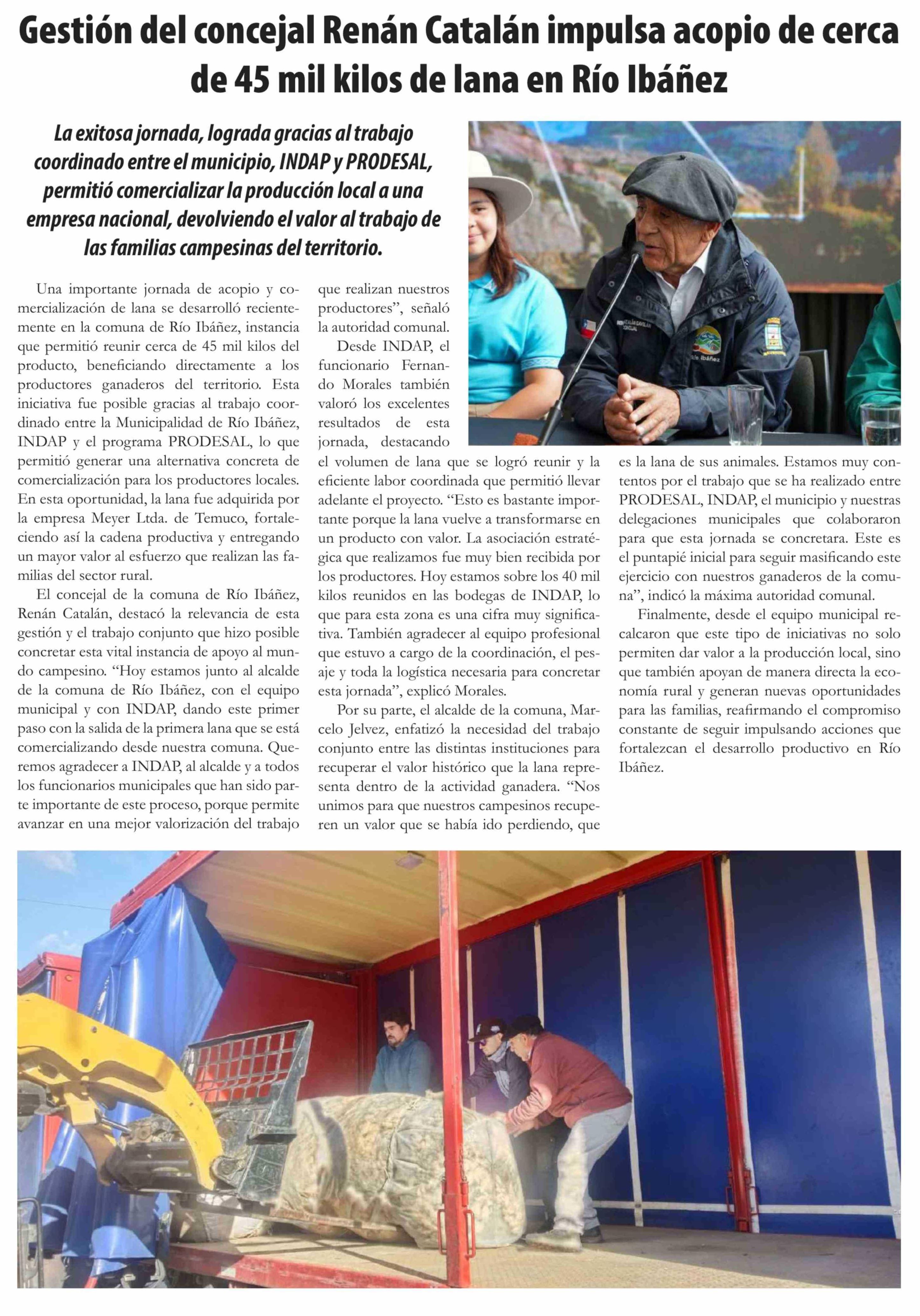 Título: Gestión del concejal Renán Catalán impulsa acopio de cerca de 45 mil kilos de lana en Río Ibáñez