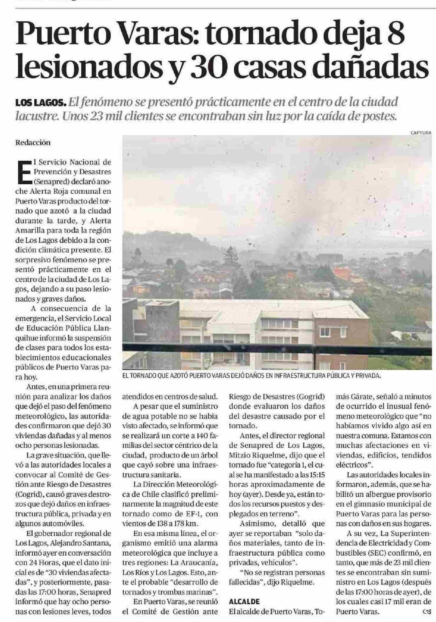 Puerto Varas: tornado deja 8 lesionados y 30 casas dañadas 26-05-2025 El Mercurio de Calama |