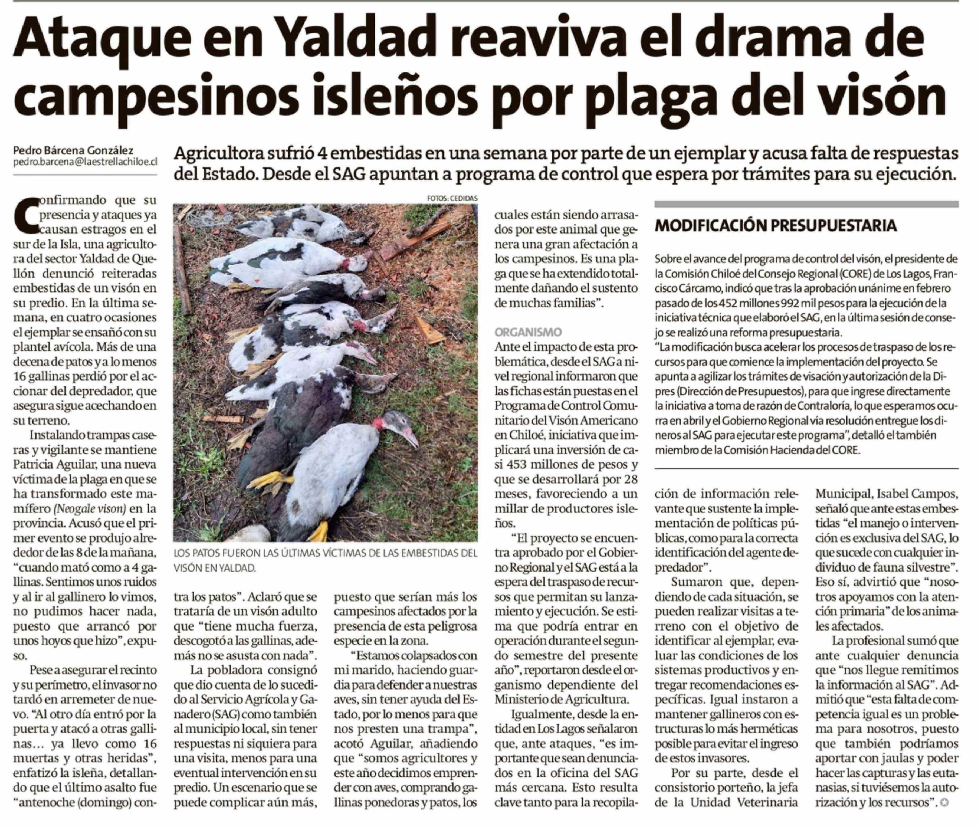 Ataque en Yaldad reaviva el drama de campesinos isleños por plaga del visón 25-03-2026 La Estrella de Chiloé |