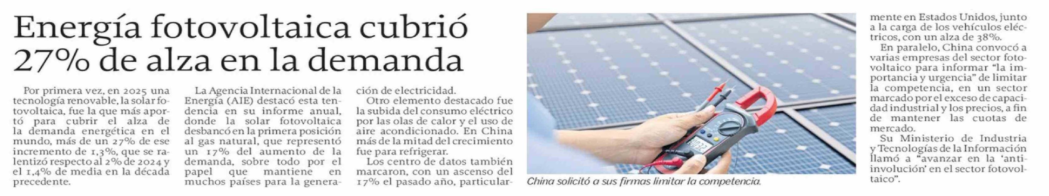 | Título: | Energía fotovoltaica cubrió 27% de alza en la demanda |