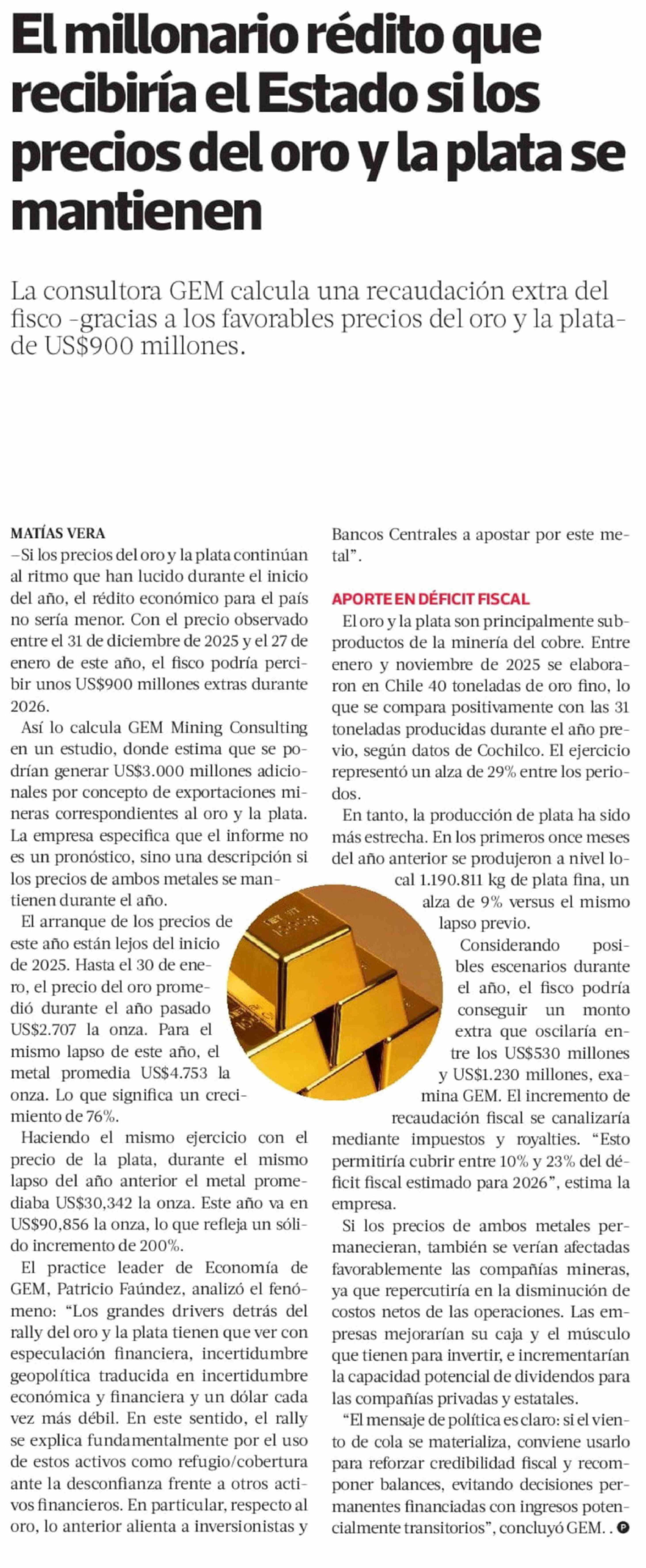 El millonario rédito que recibiría el Estado si los precios del oro y la plata se mantienen 03-02-2026 La Tercera |