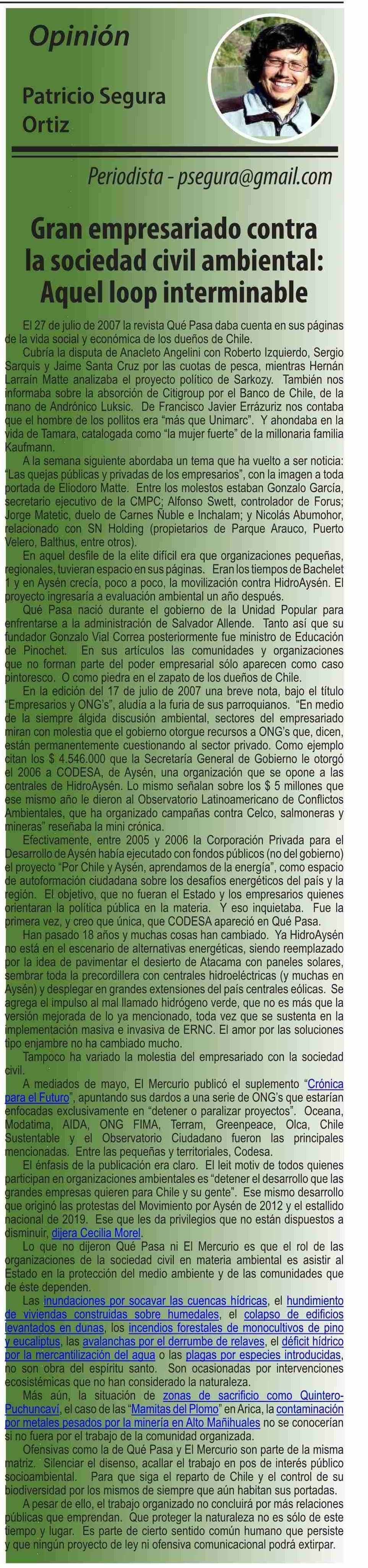 | Título: | COLUMNAS DE OPINIÓN: Gran empresariado contra la sociedad civil ambiental, Aquel loop interminable |