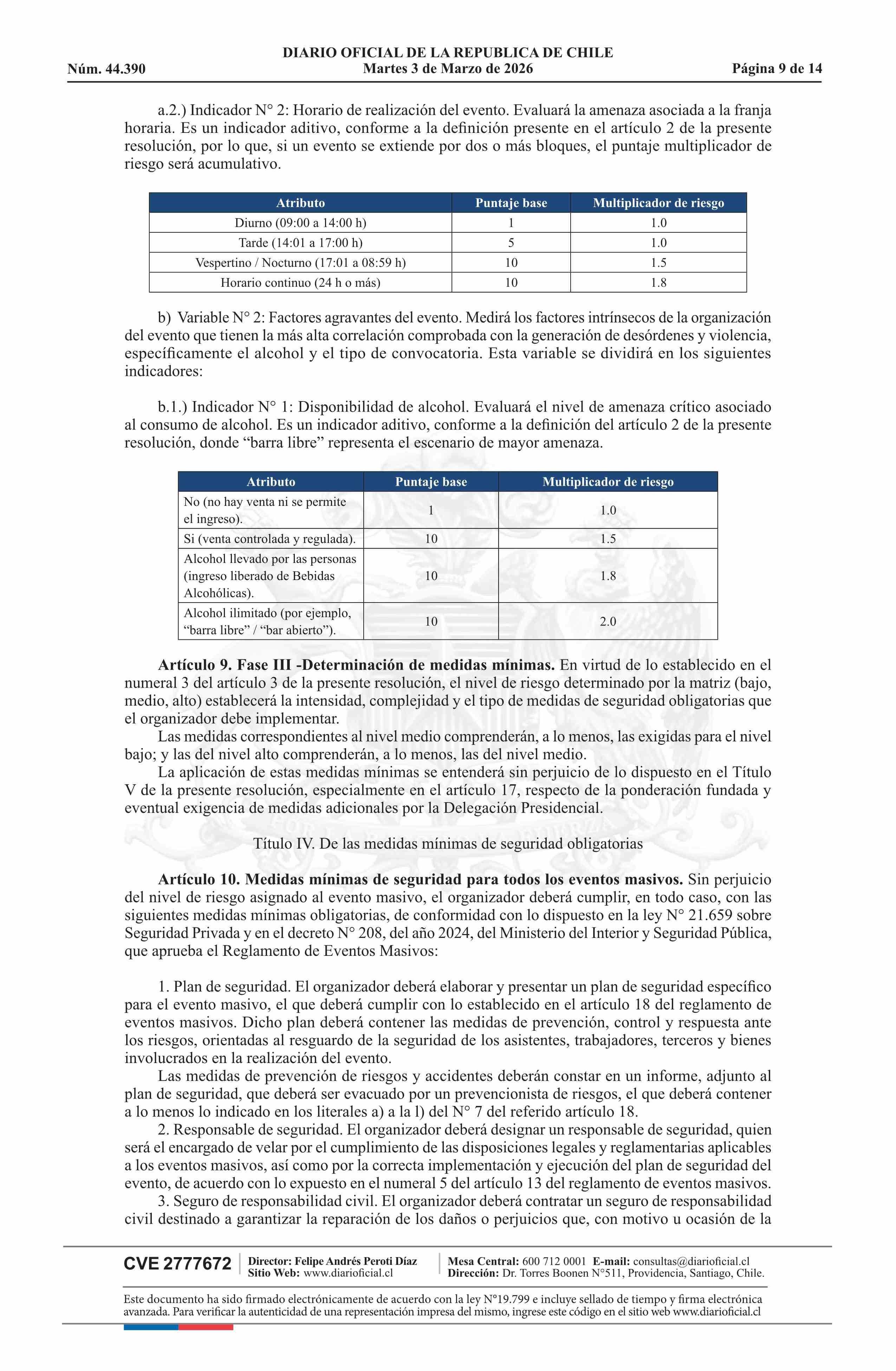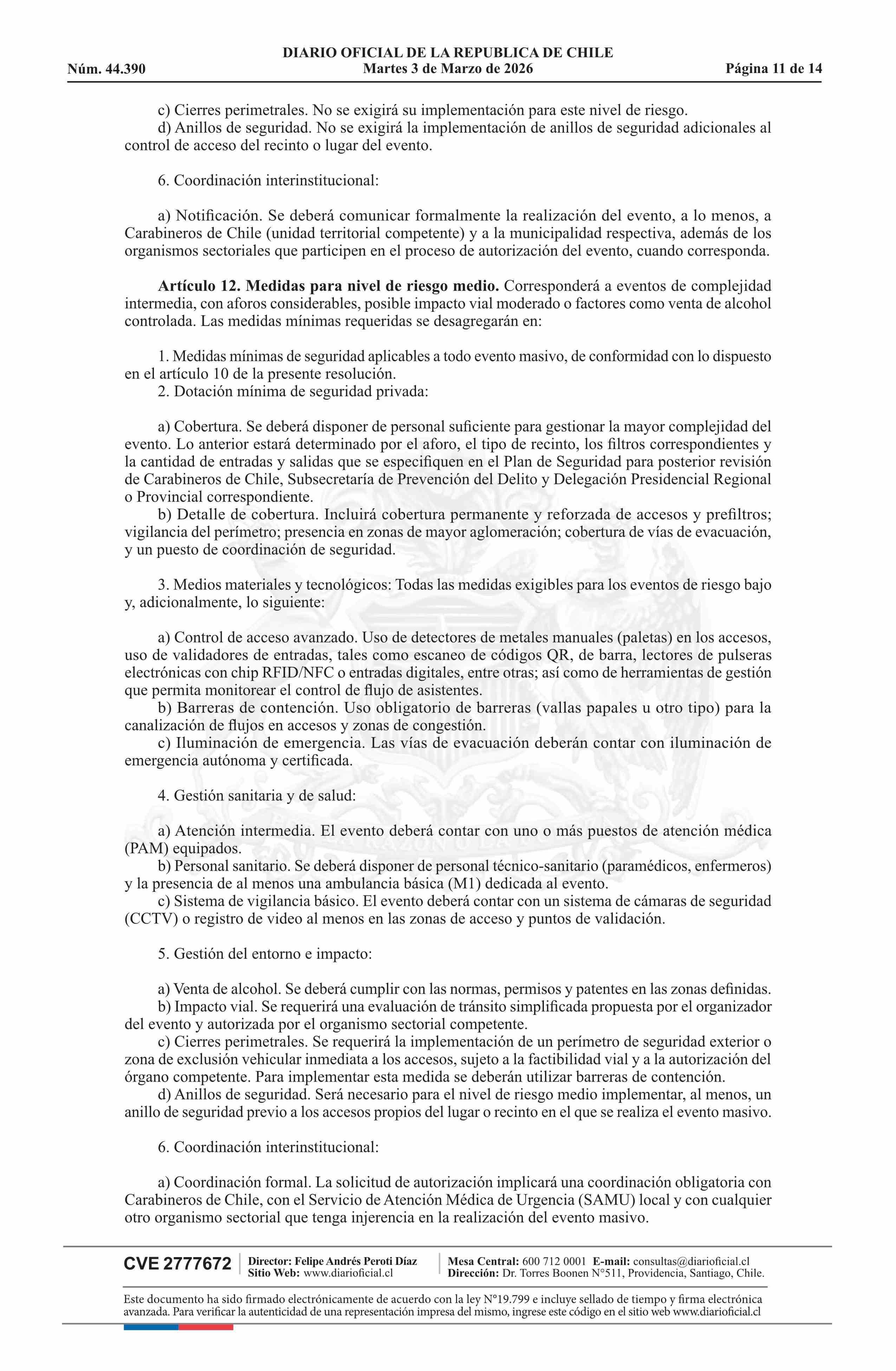| Título: | Resolución exenta número 772, de 2026.- Clasifica eventos masivos, según materia y tipo de riesgo que presentan para la seguridad y orden público, y establece medidas mínimas de seguridad, de acuerdo a modelo que indica |