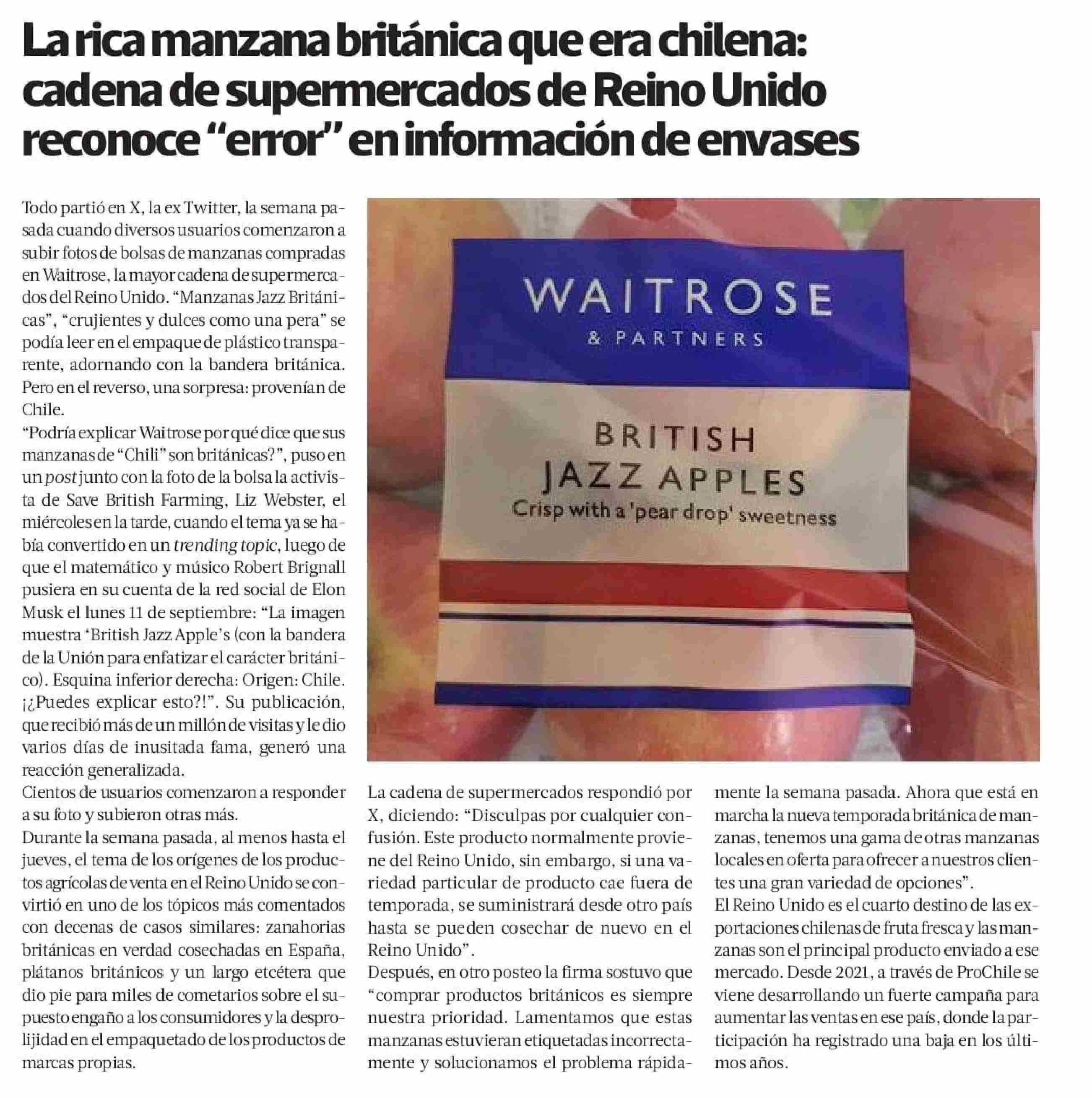 La rica manzana británica que era chilena: cadena de supermercados de Reino Unido reconoce “error” en información de envases 21-09-2023 La Tercera |