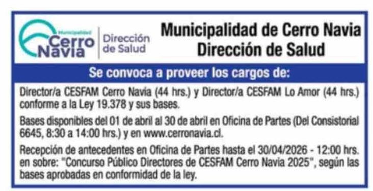 | Título: | Extractos: Municipalidad de Cerro Navia Dirección de Salud Dirección de Salud Cerro .Navia Se convoca a proveer los cargos de: Director/a CESFAM Cerro Navia (44 hrs.) y Director/a CESFAM Lo Amor (44 hrs.) conforme a la Ley 19.378 y sus bases. Bases disponibles del 01 de abril al 30 de abril en Ofici |