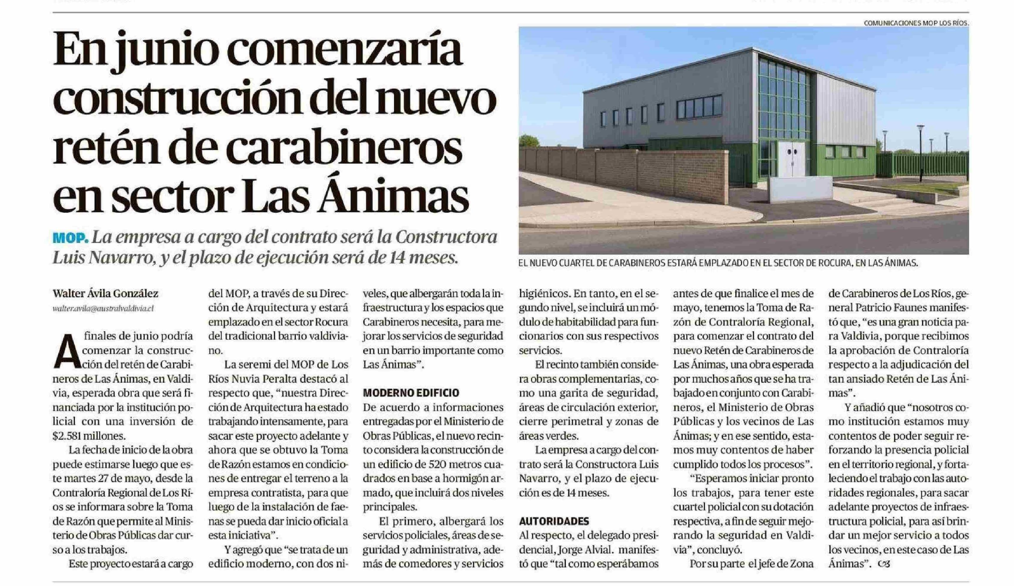 En junio comenzaría construcción del nuevo retén de carabineros en sector Las Animas 30-05-2025 Diario Austral Región de Los Ríos |