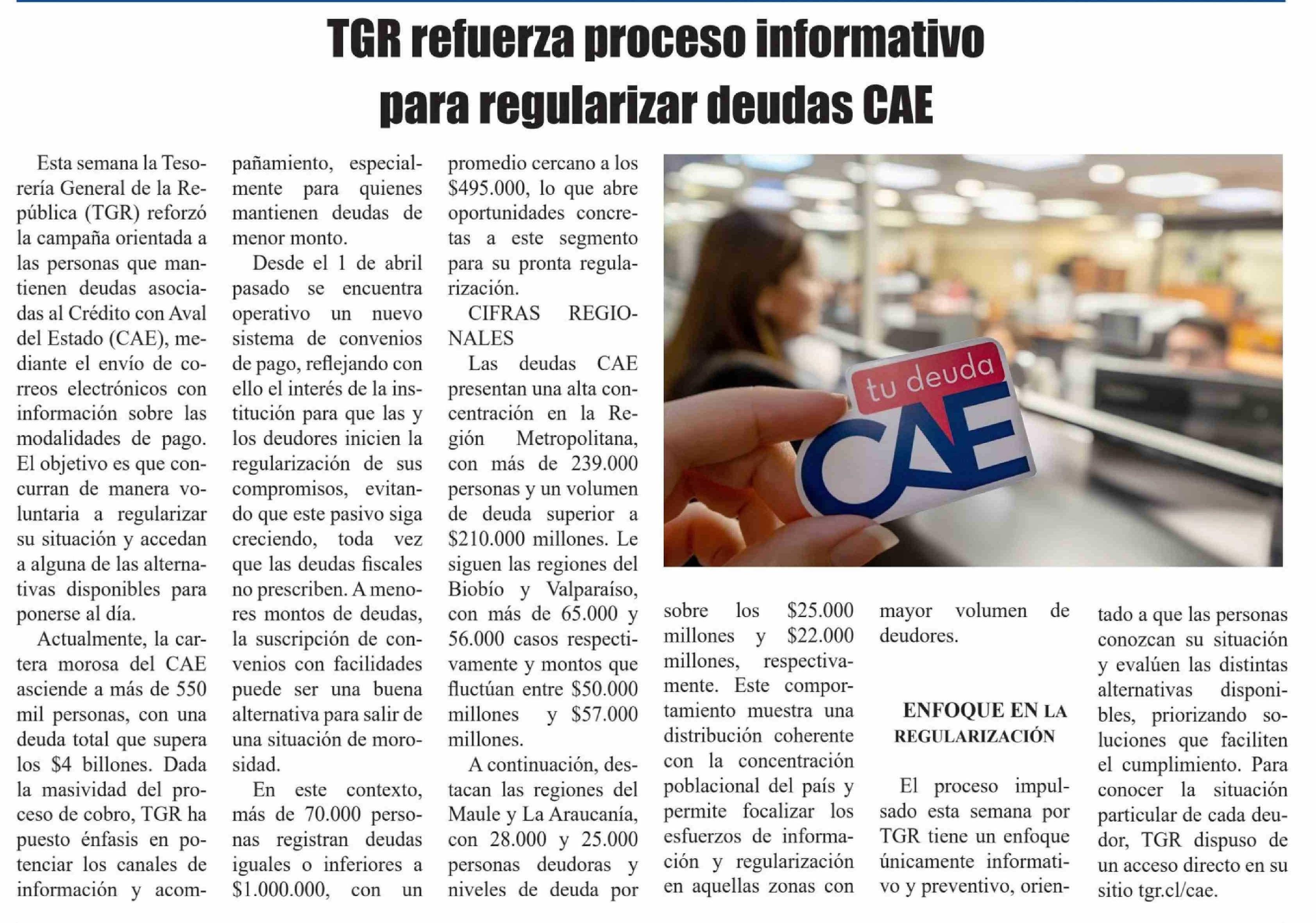 | Título: | TGR refuerza proceso informativo para regularizar deudas CAE |