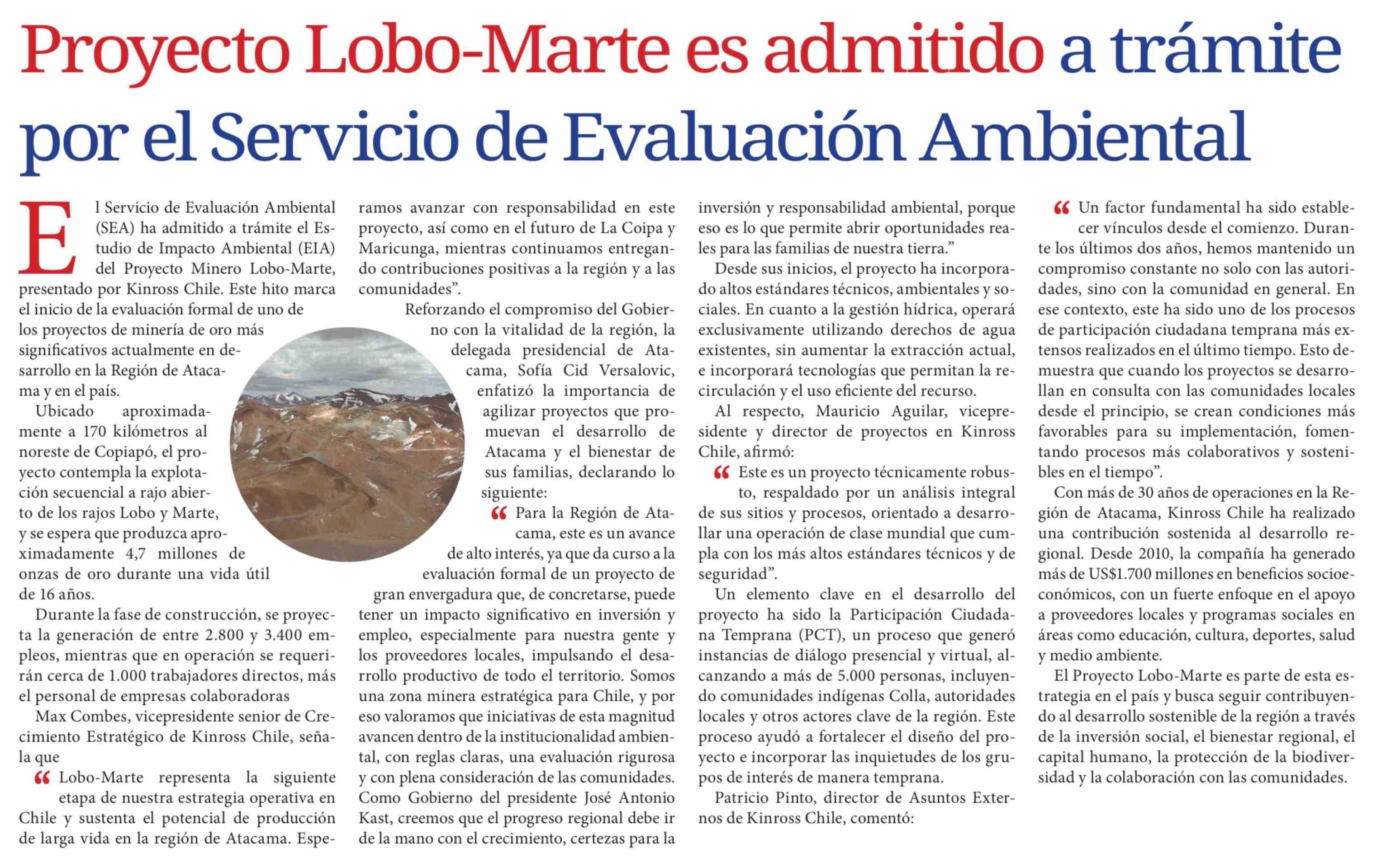 Proyecto Lobo-Marte es admitido a trámite por el Servicio de Evaluación Ambiental 13-04-2026 Diario Chañarcillo |