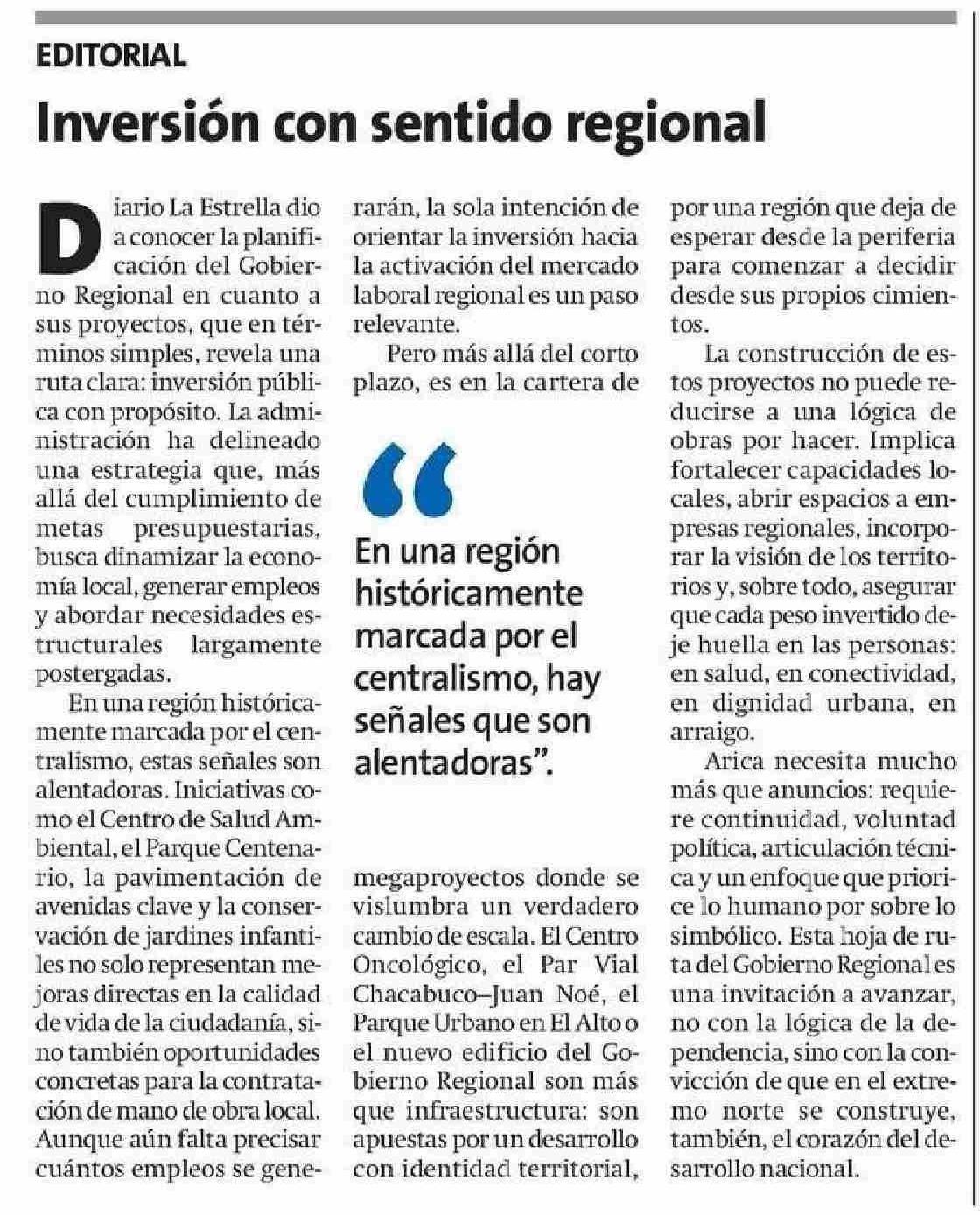 Editorial: Inversión con sentido regional 17-06-2025 La Estrella de Arica |