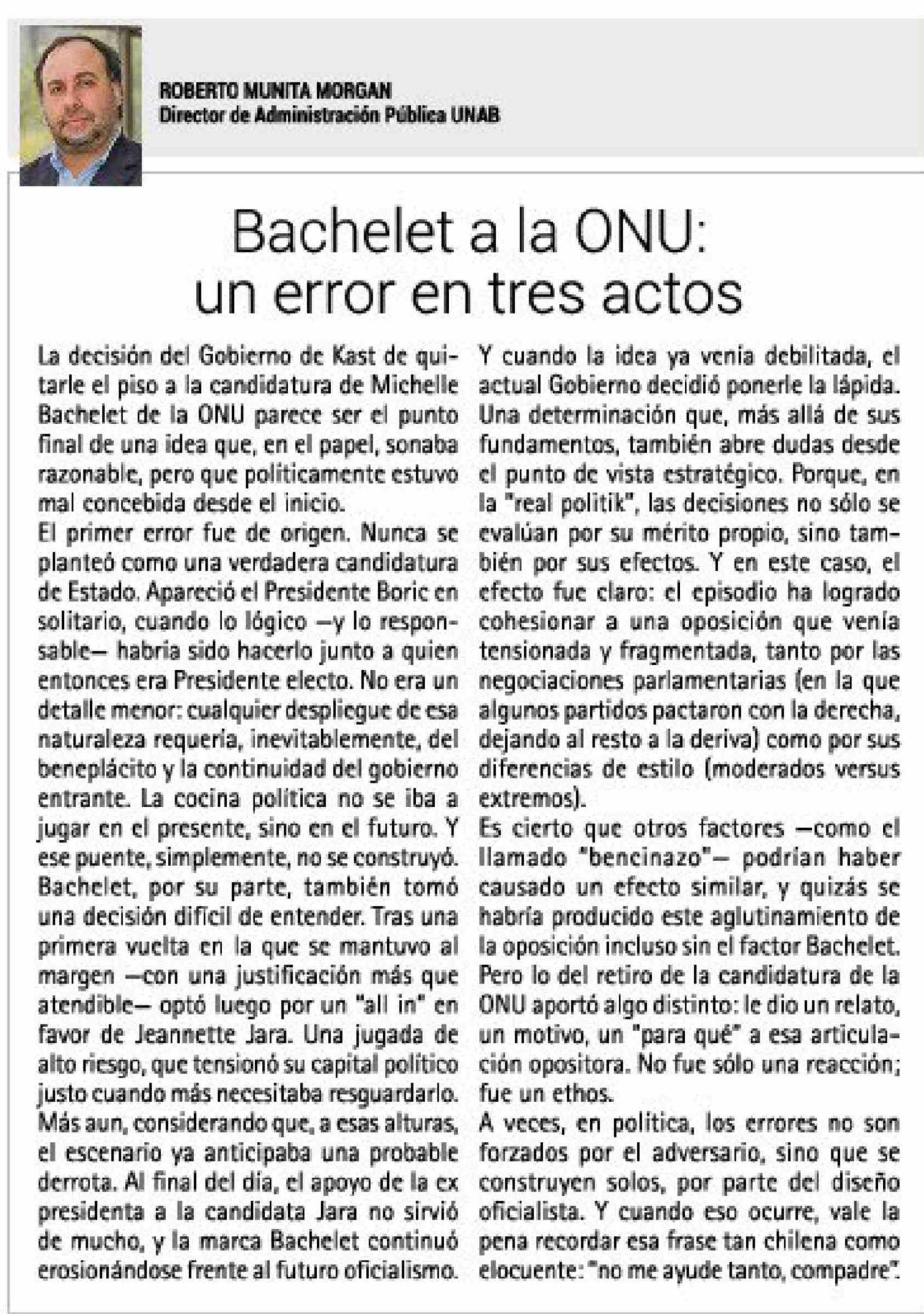 Título: Columnas de Opinión: Bachelet a la ONU: un error en tres actos