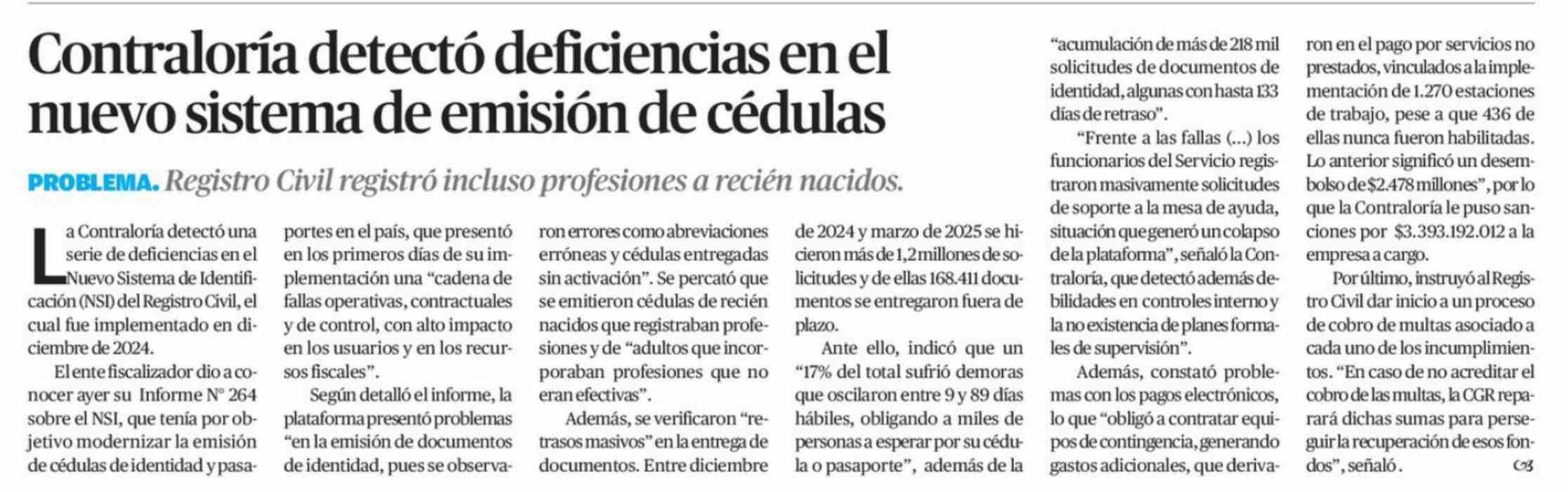 Contraloría detectó deficiencias en el nuevo sistema de emisión de cédulas 28-03-2026 El Mercurio de Calama |
