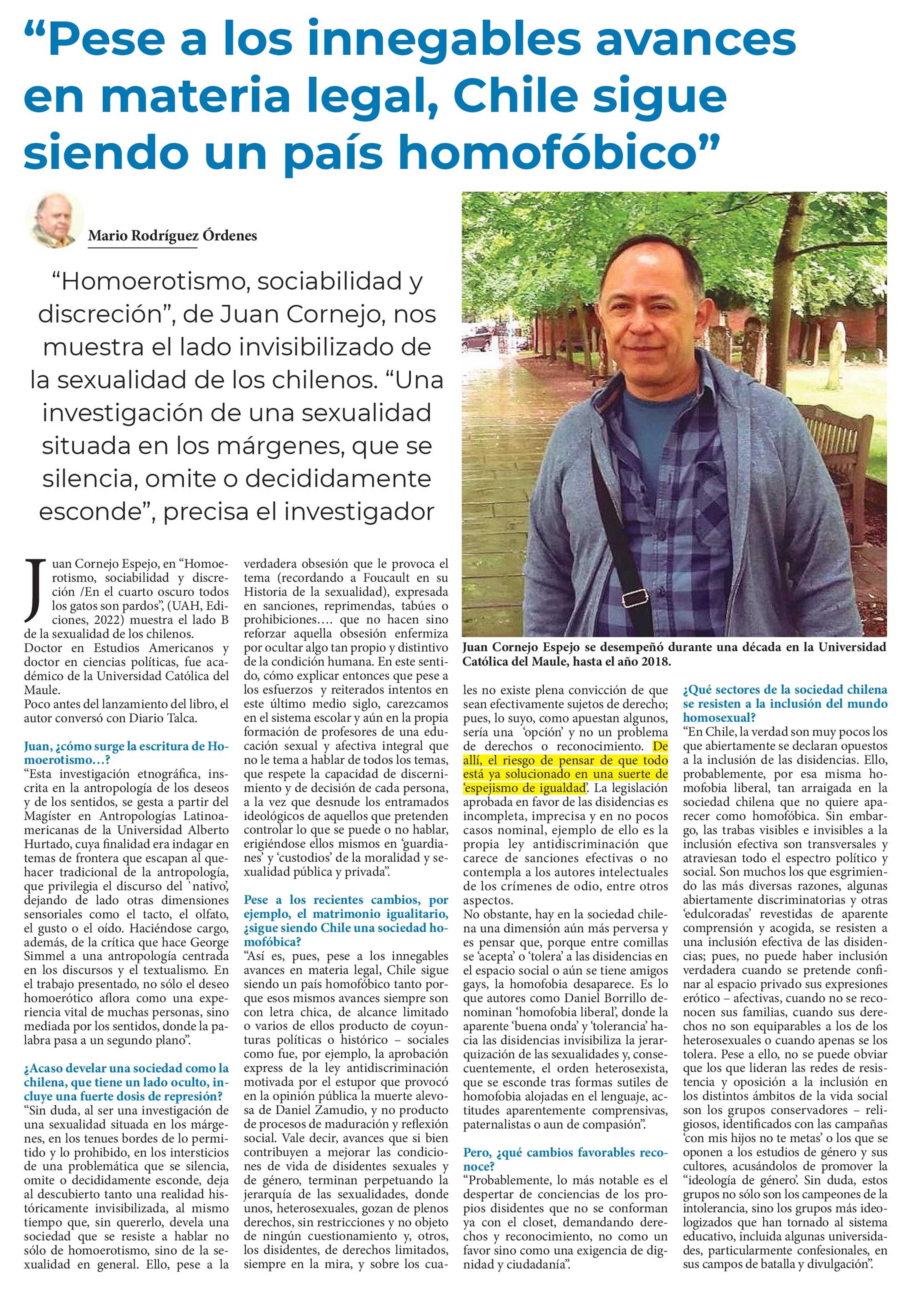 “Pese a los innegables avances en legal, Chile sigue siendo un país homofóbico” 24-09-2022 Diario Talca |