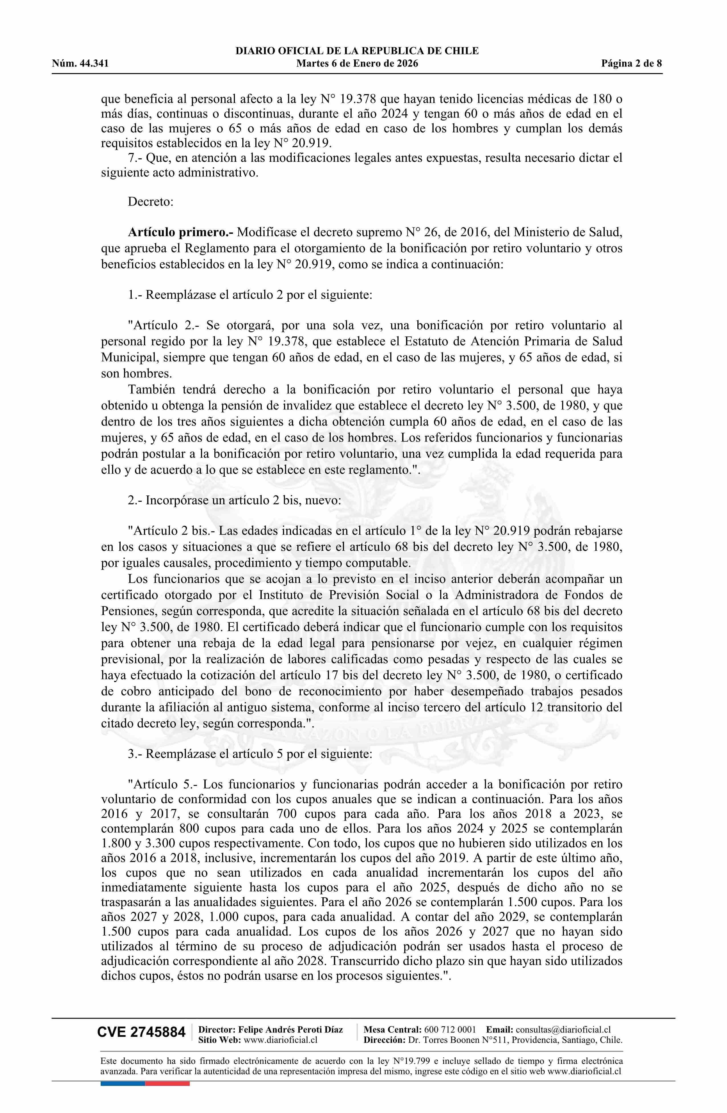 Decreto número 13, de 2025.- Modifica decreto N° 26, de 2016, Reglamento para el otorgamiento de la bonificación por retiro voluntario y otros beneficios establecidos en la ley N° 20.919 06-01-2026 DIARIO OFICIAL CHILE - BOLETÍN OFICIAL DE MINERÍA |