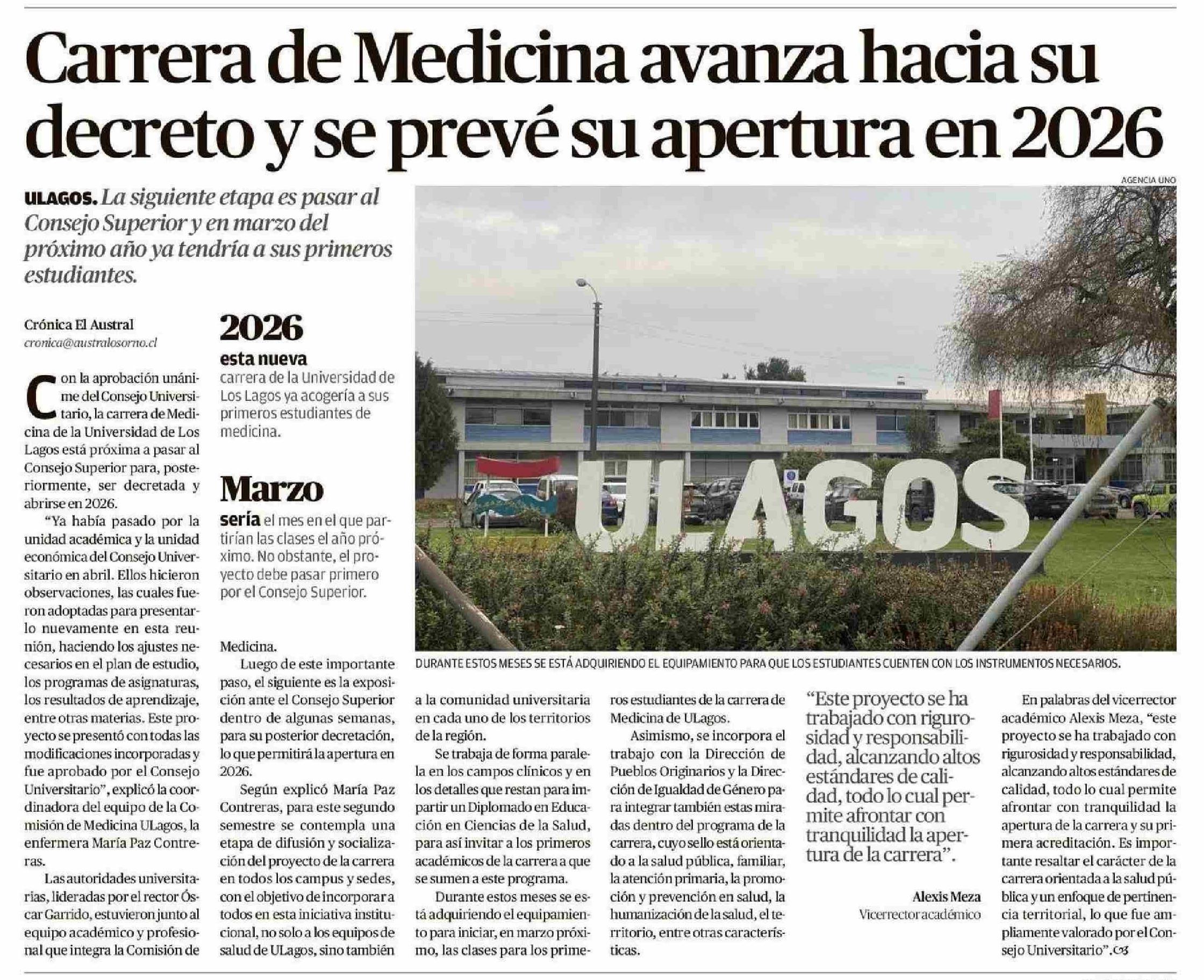 Carrera de Medicina avanza hacia su decreto y se prevé su apertura en 2026 08-06-2025 El Austral de Osorno |