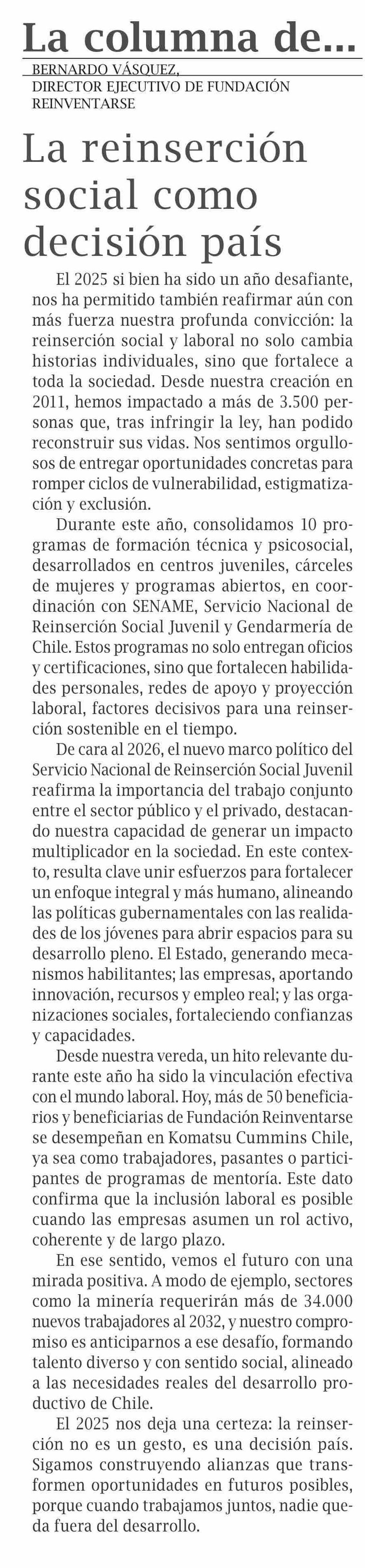 Columnas de Opinión: La reinserción social como decisión país 28-01-2026 El Pingüino |
