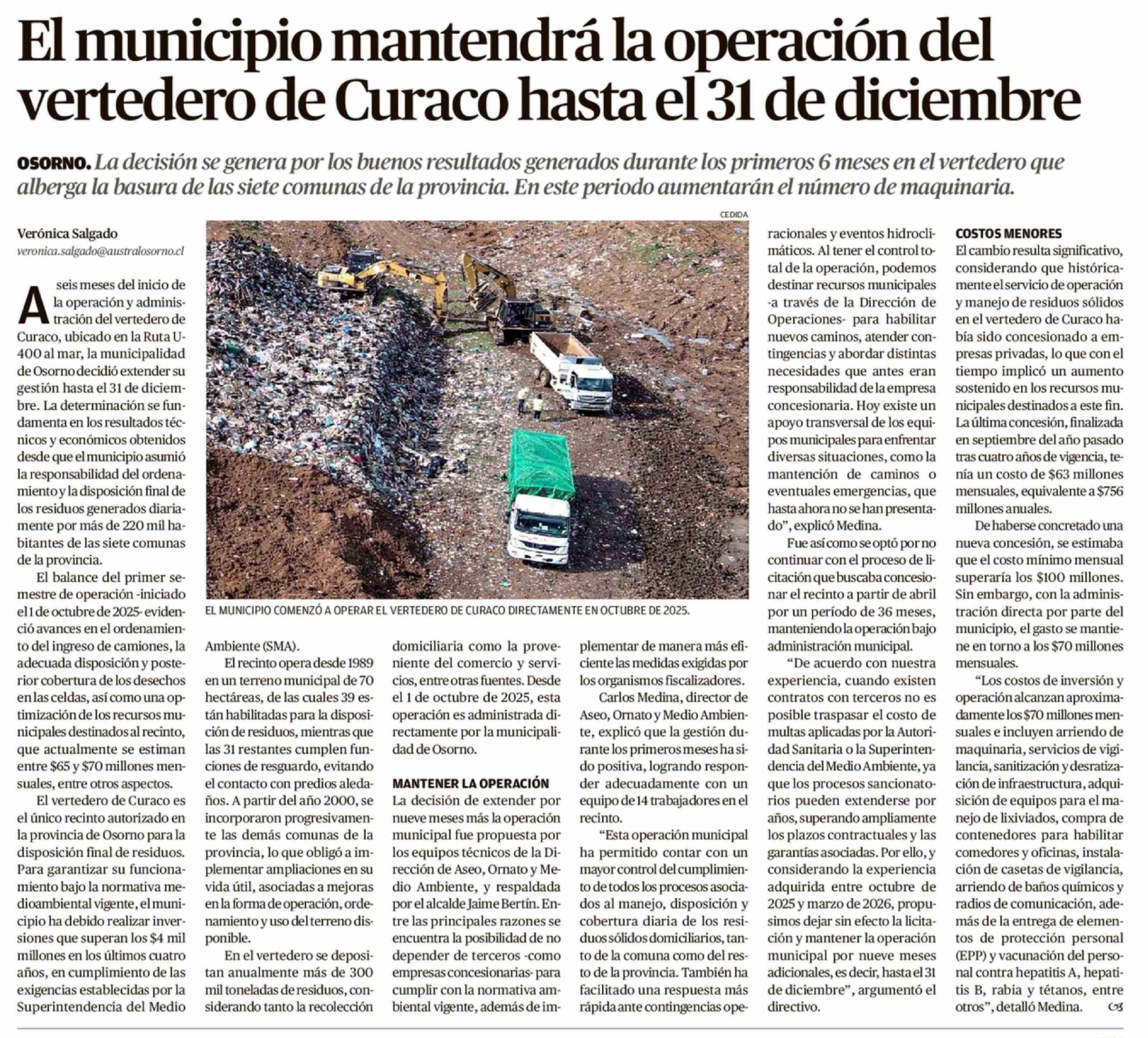 El municipio mantendrá la operación del vertedero de Curaco hasta el 31 de diciembre 28-03-2026 El Austral de Osorno |
