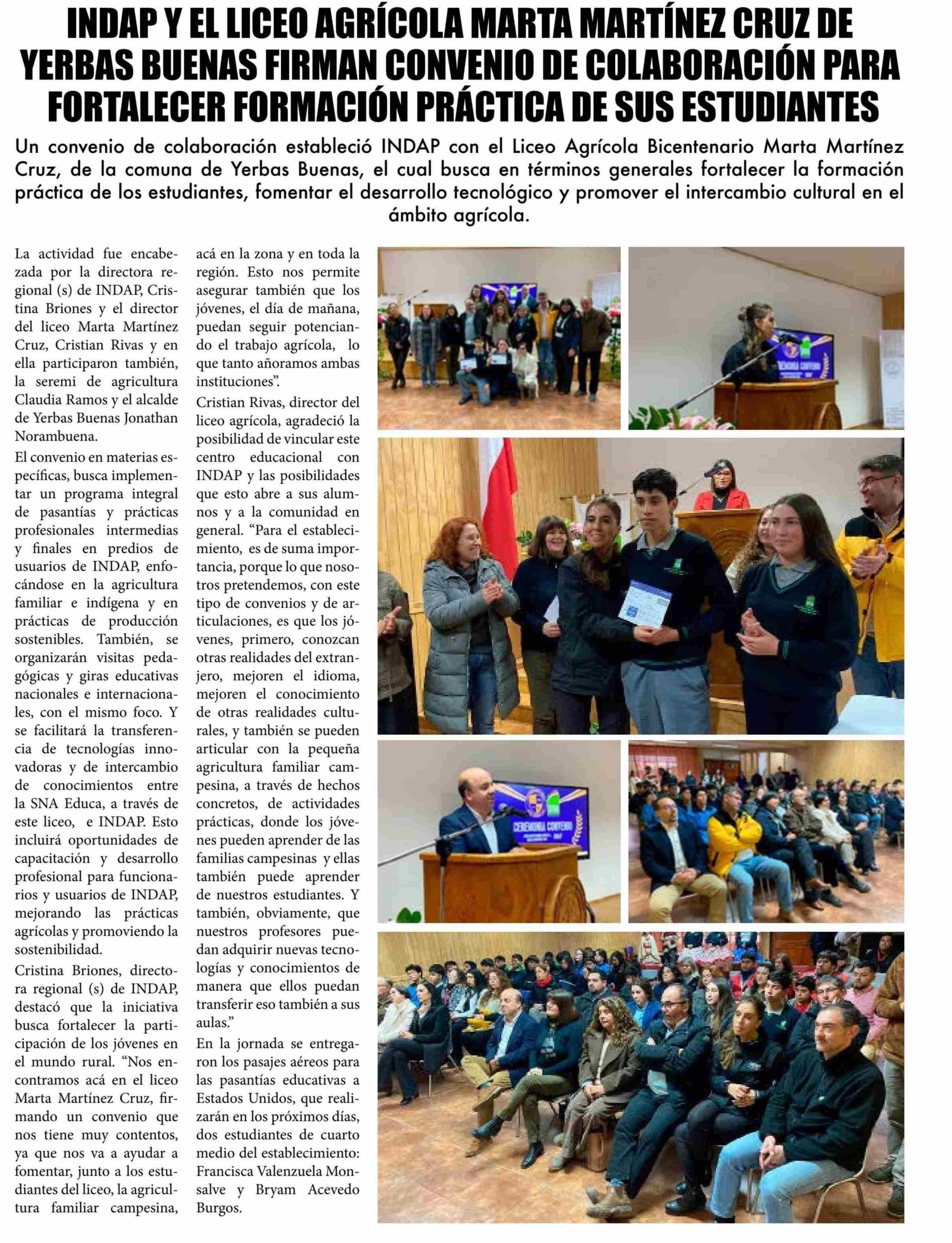 INDAP Y El LICEO AGRÍCOLA MARTA MARTÍNEZ CRUZ DE YERBAS BUENAS FIRMAN CONVENIO DE COLABORACIÓN PARA FORTALECER FORMACIÓN PRÁCTICA DE SUS ESTUDIANTES 08-06-2025 El Lector |