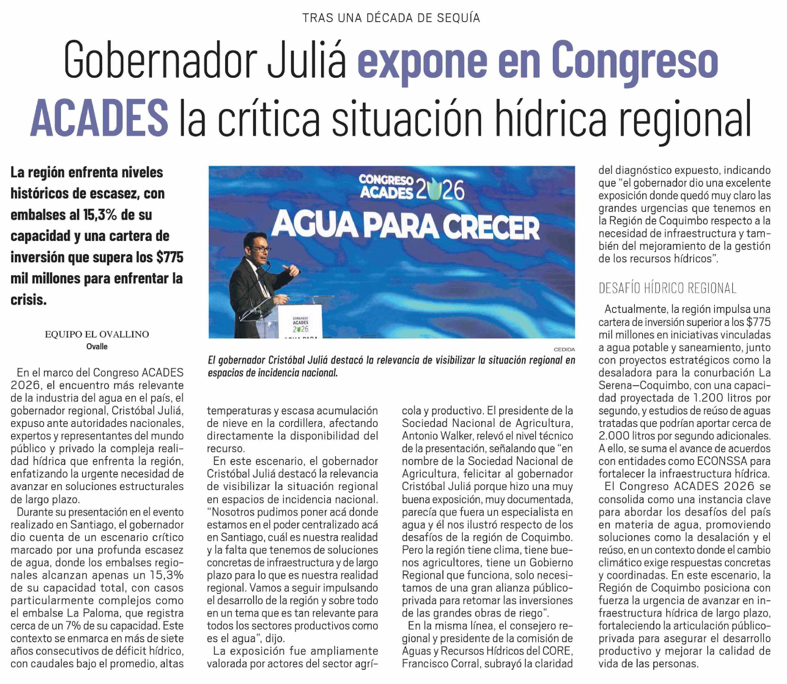 Título: Gobernador Juliá expone en Congreso ACADES la crítica situación hídrica regional