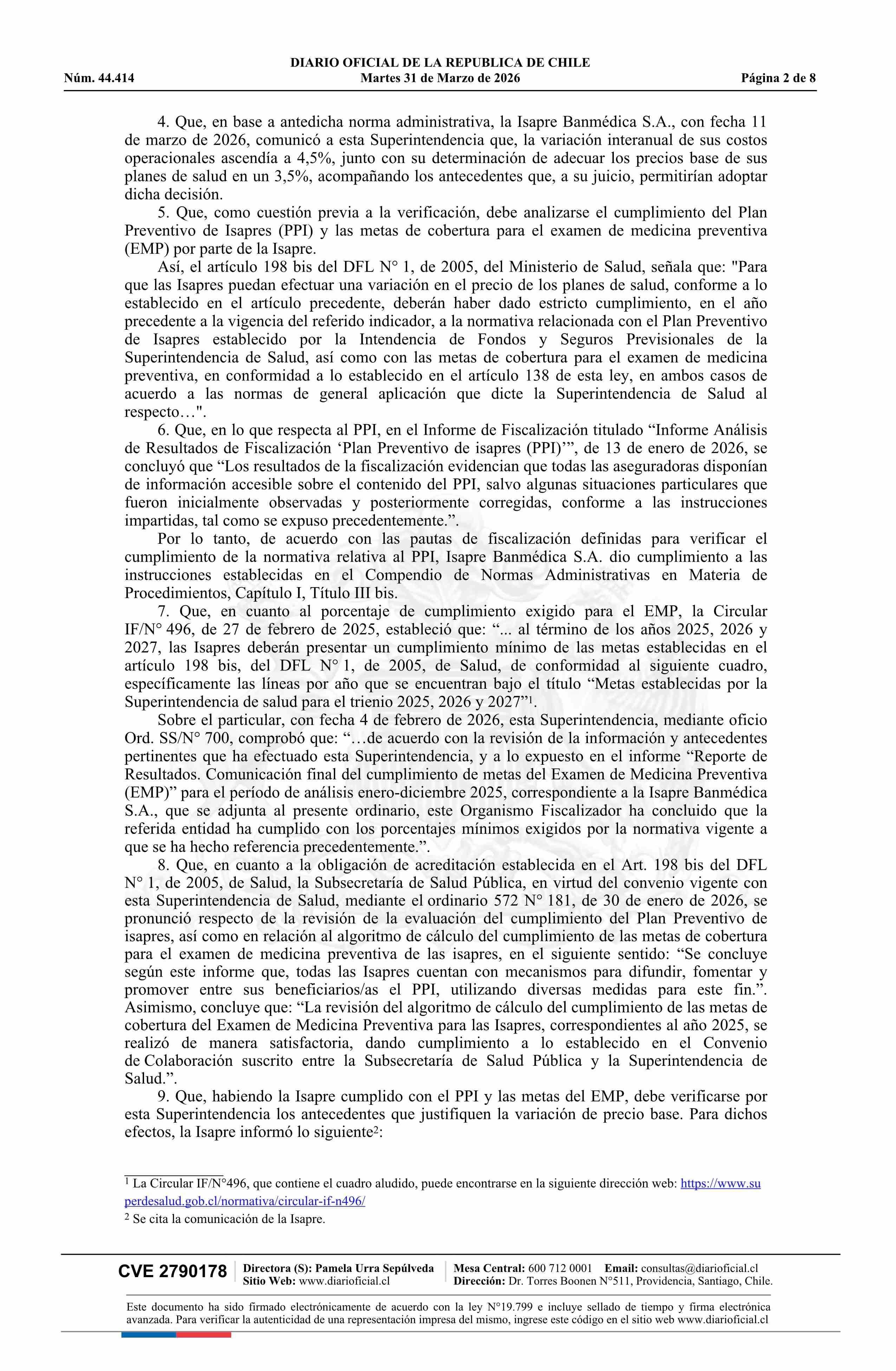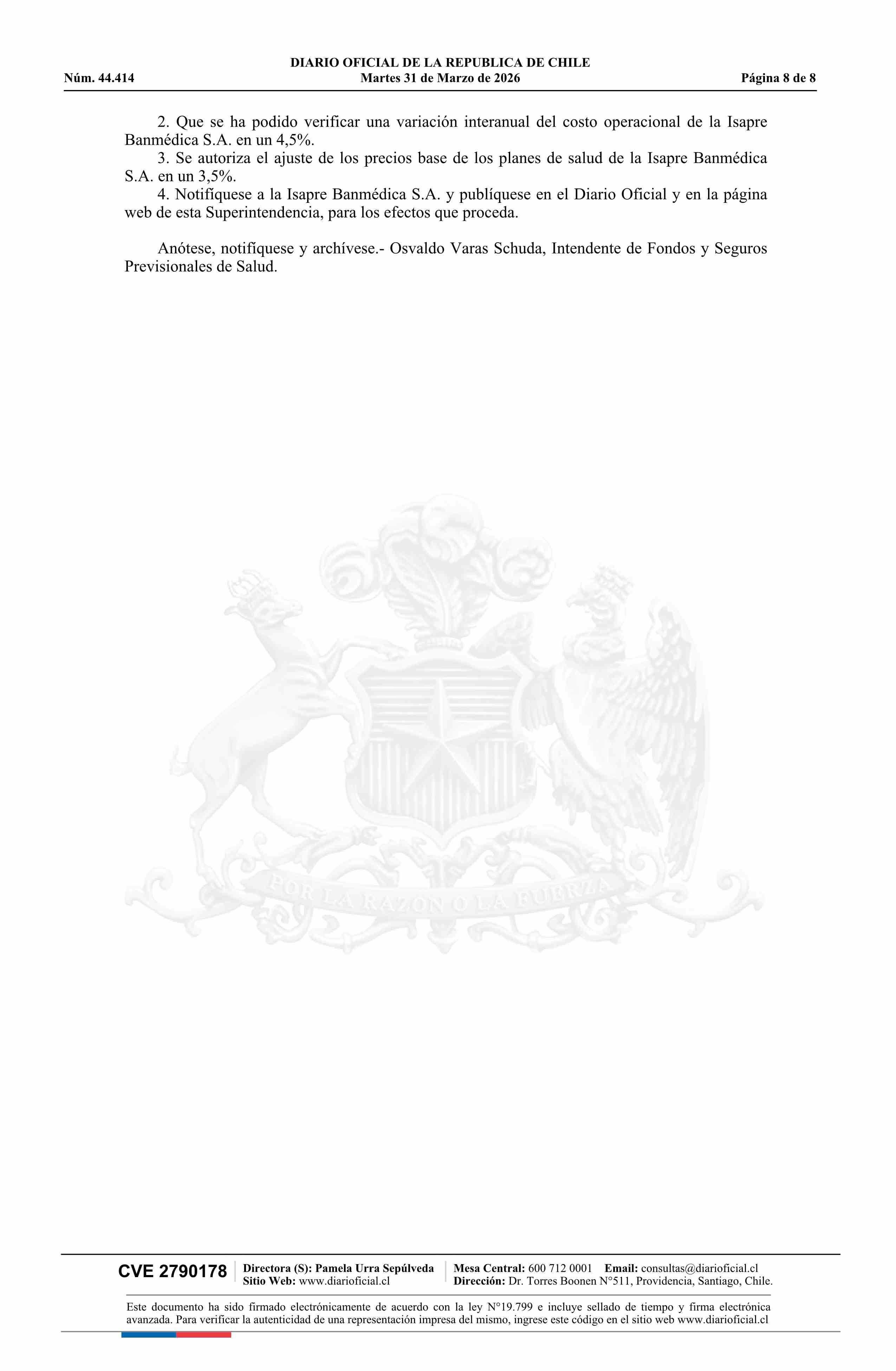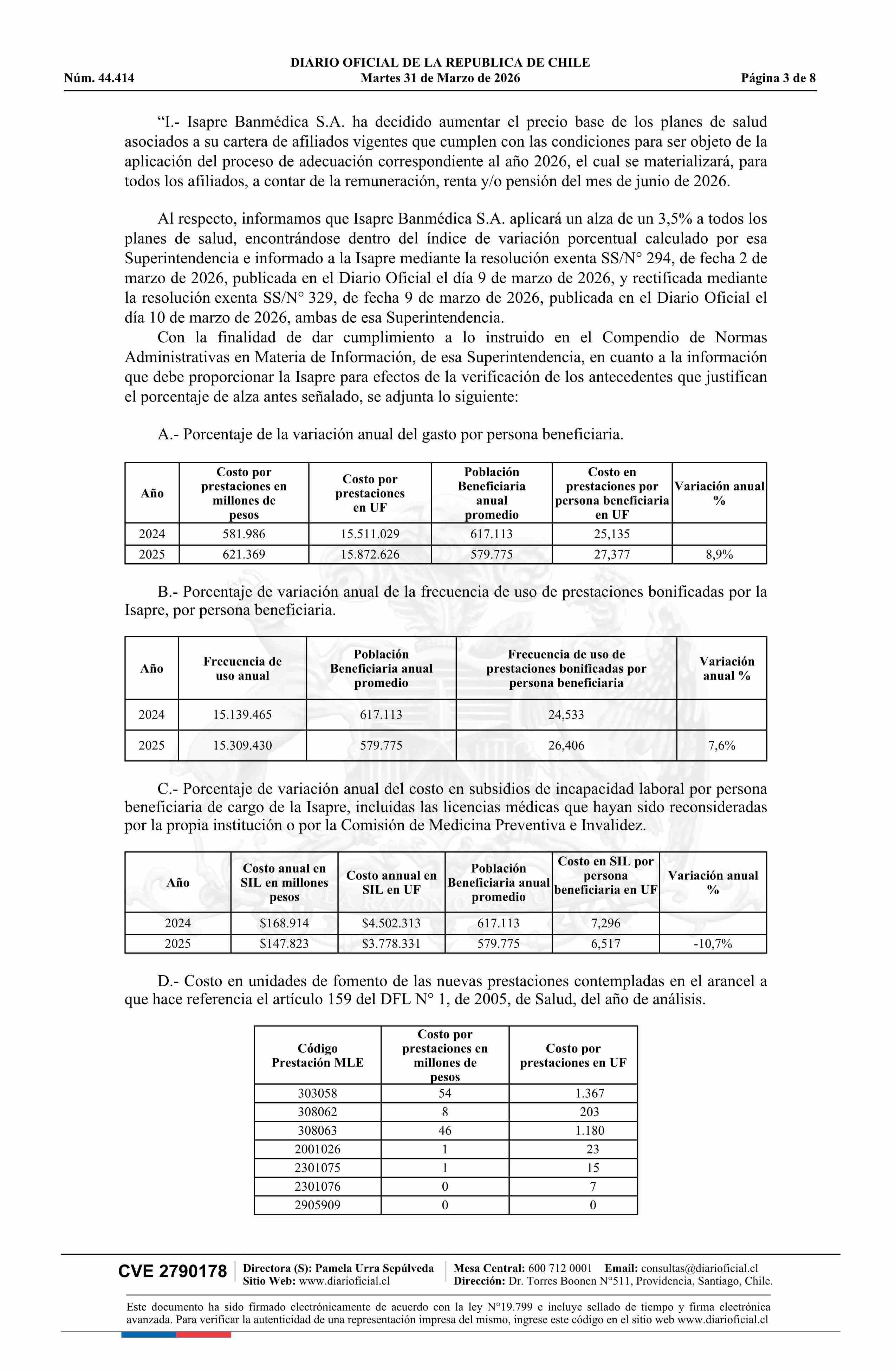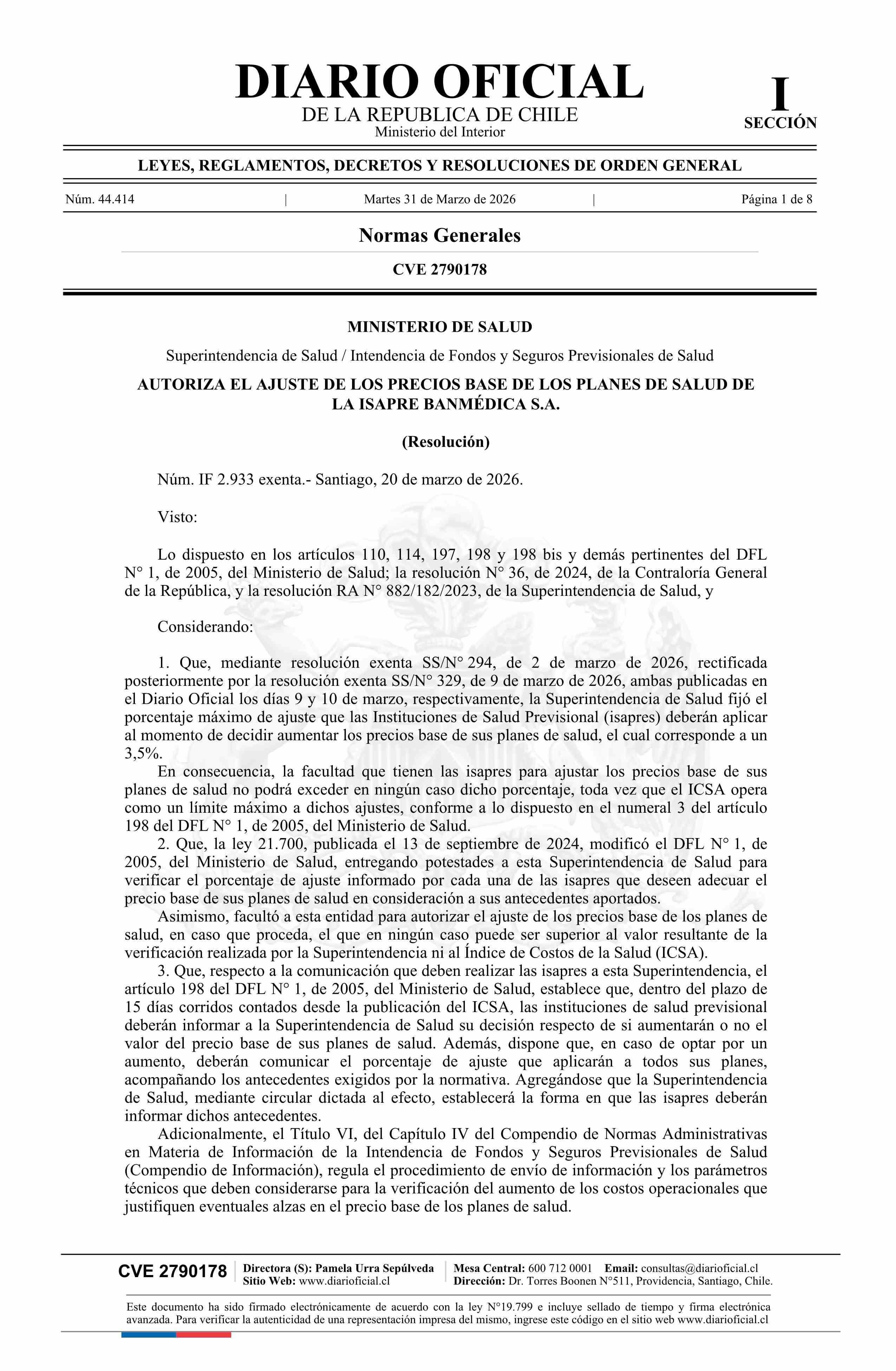 Resolución exenta número IF 2.933, de 2026.- Autoriza el ajuste de los precios base de los planes de salud de la Isapre Banmédica S.A. 31-03-2026 Diario Oficial Edición Electrónica |