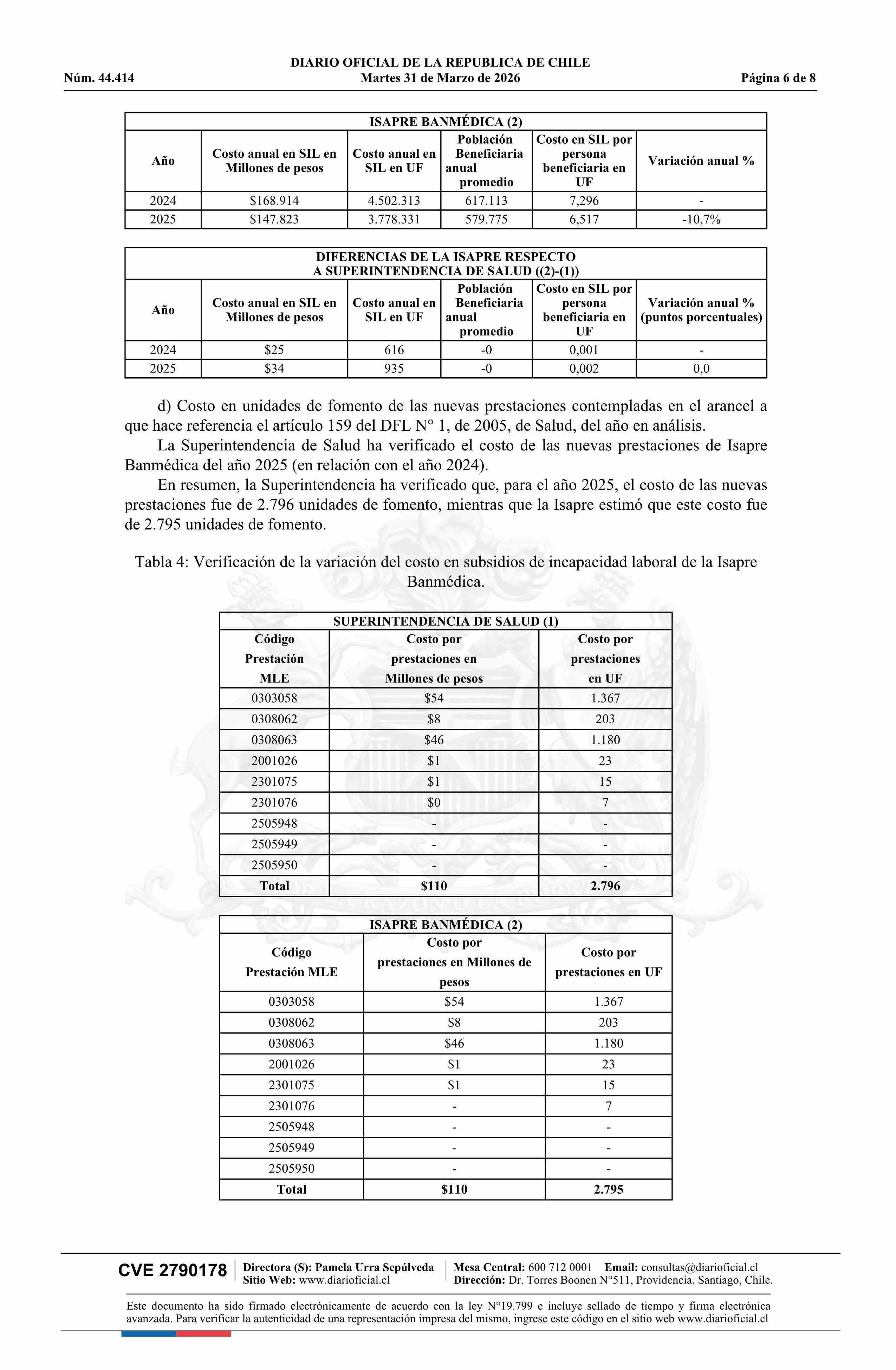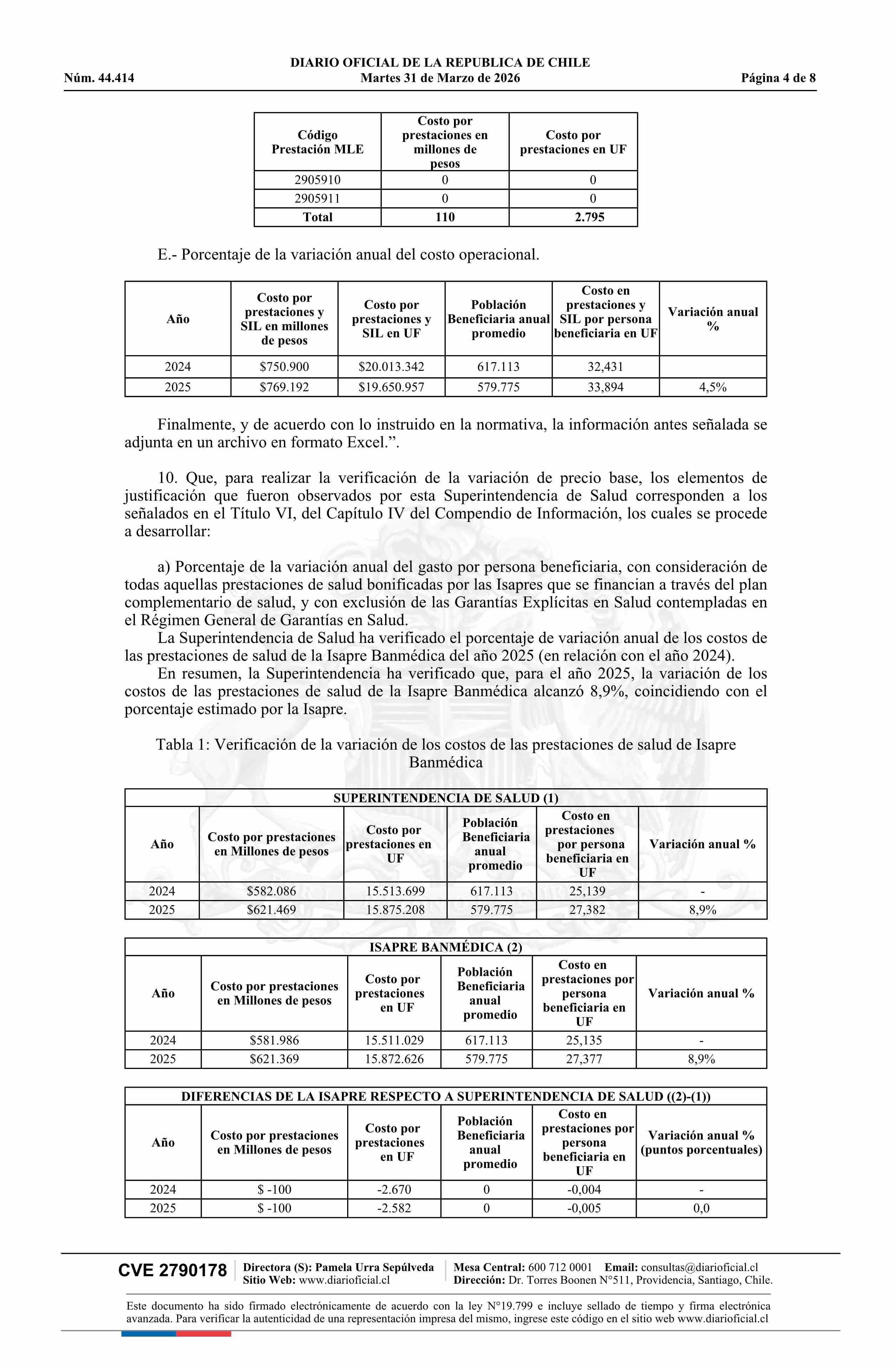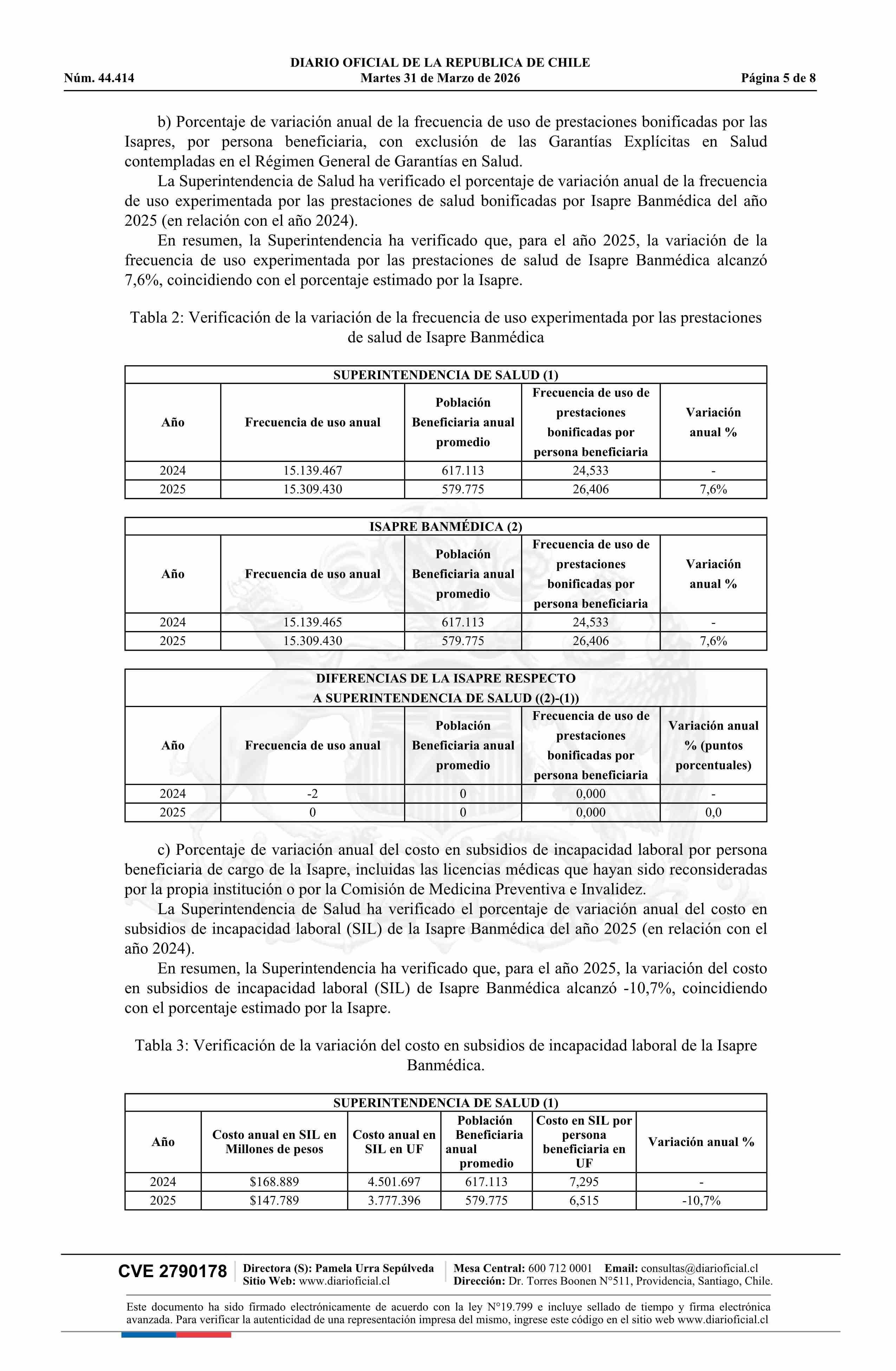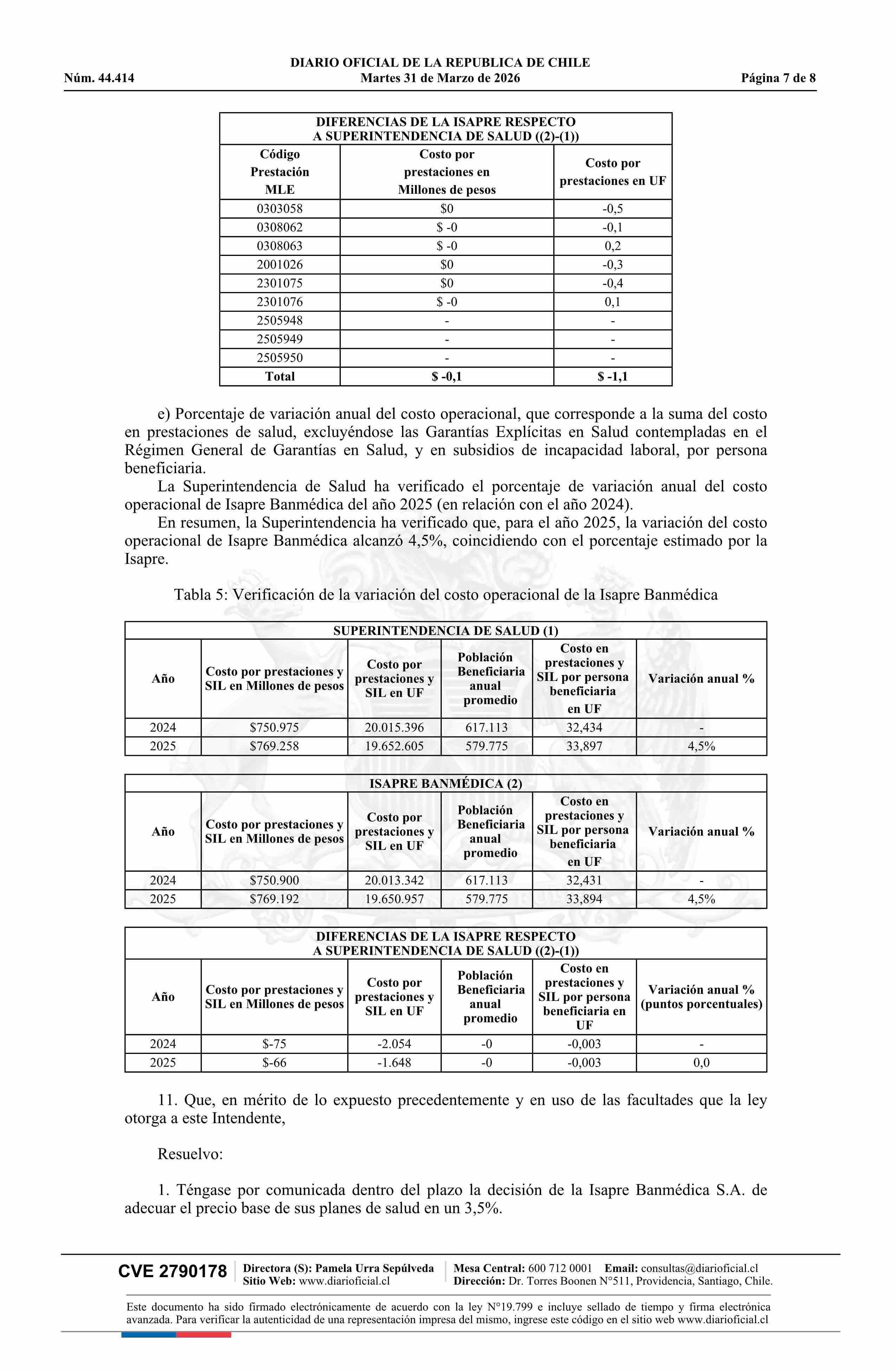 Resolución exenta número IF 2.933, de 2026.- Autoriza el ajuste de los precios base de los planes de salud de la Isapre Banmédica S.A. 31-03-2026 Diario Oficial Edición Electrónica |