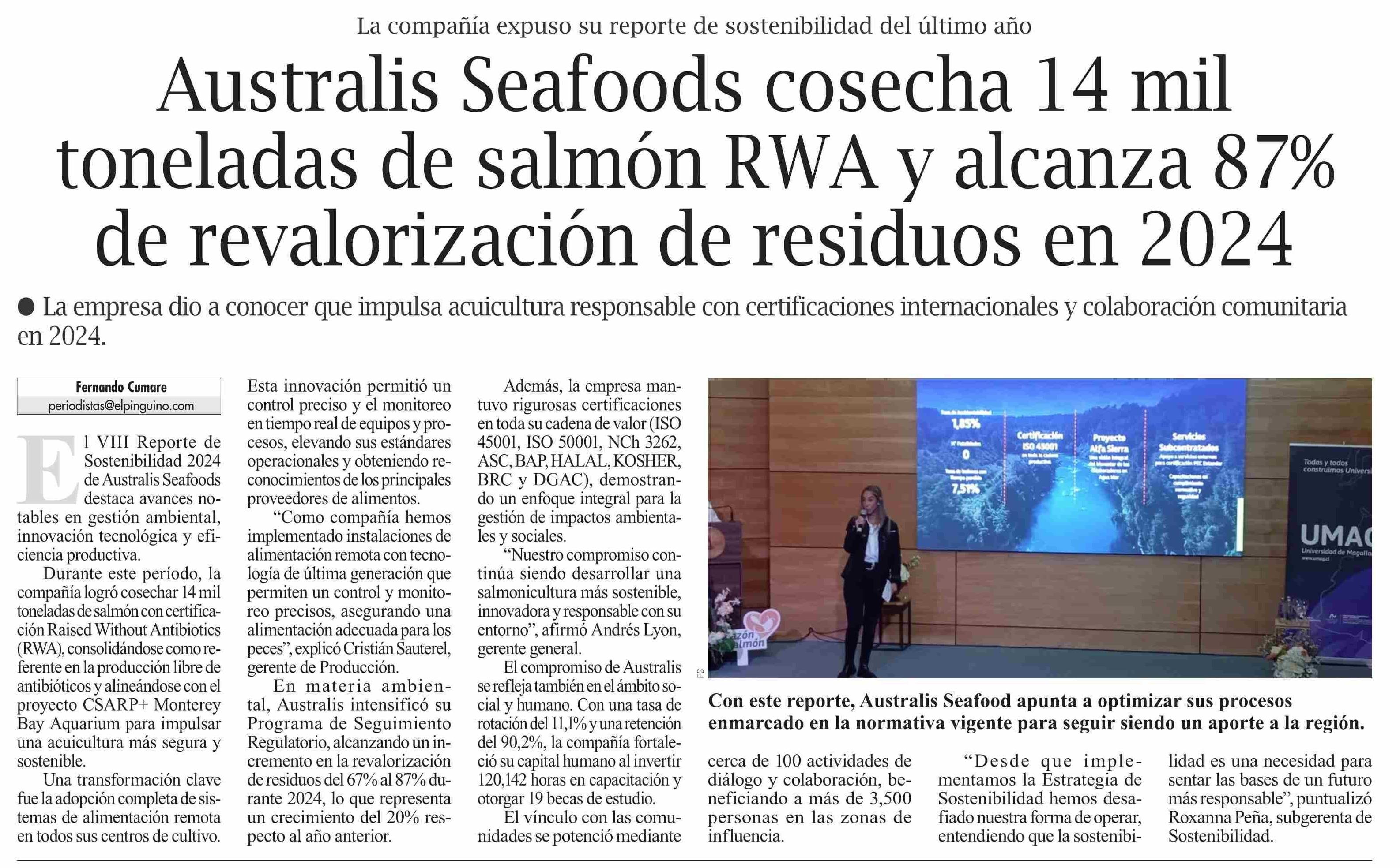 Australis Seafoods cosecha 14 mil toneladas de salmón RWA y alcanza 87% de revalorización de residuos en 2024 29-05-2025 El Pingüino |