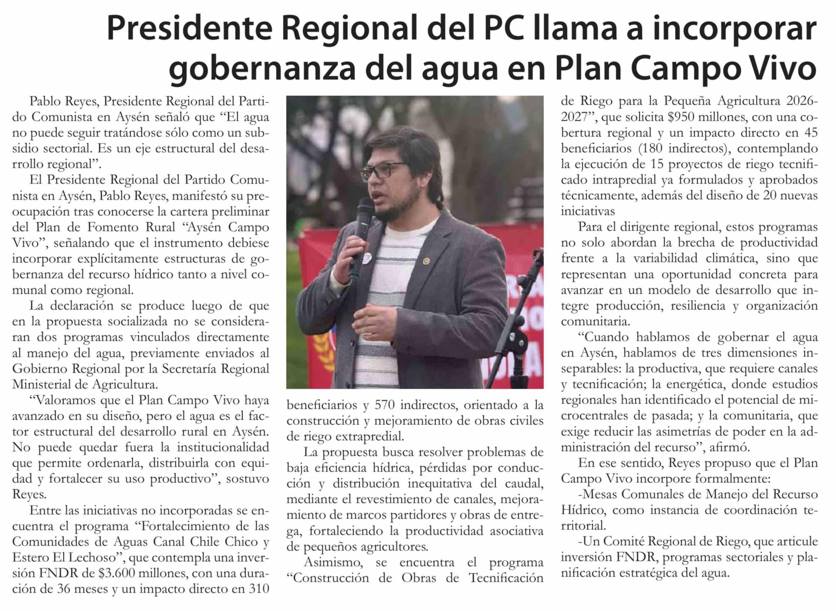 Presidente Regional del PC llama a incorporar gobernanza del agua en Plan Campo Vivo 14-02-2026 El Divisadero |
