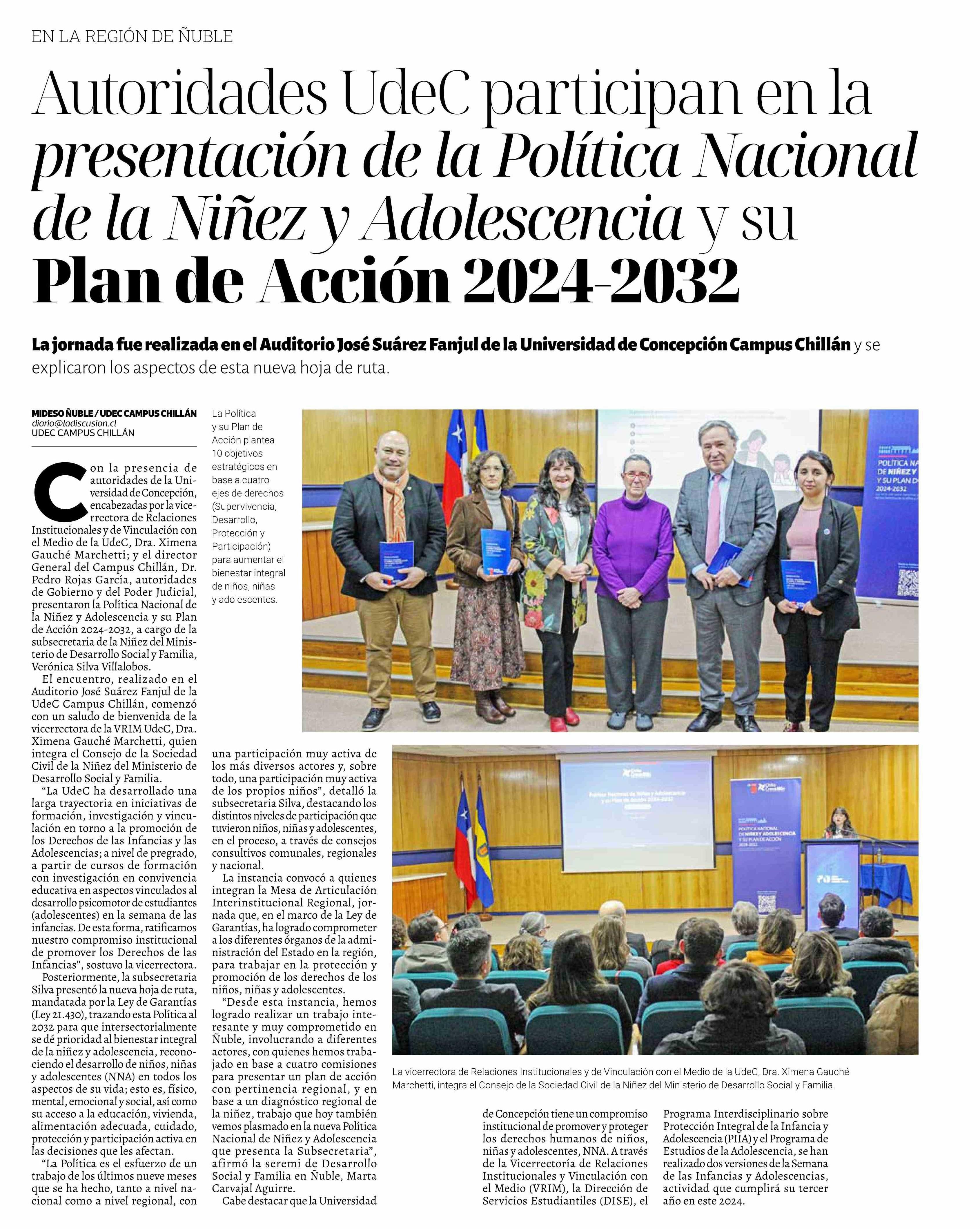 Autoridades UdeC participan en la presentación de la Política Nacional de la Niñez y Adolescencia y su Plan de Acción 2024-2032 18-06-2024 La Discusión |