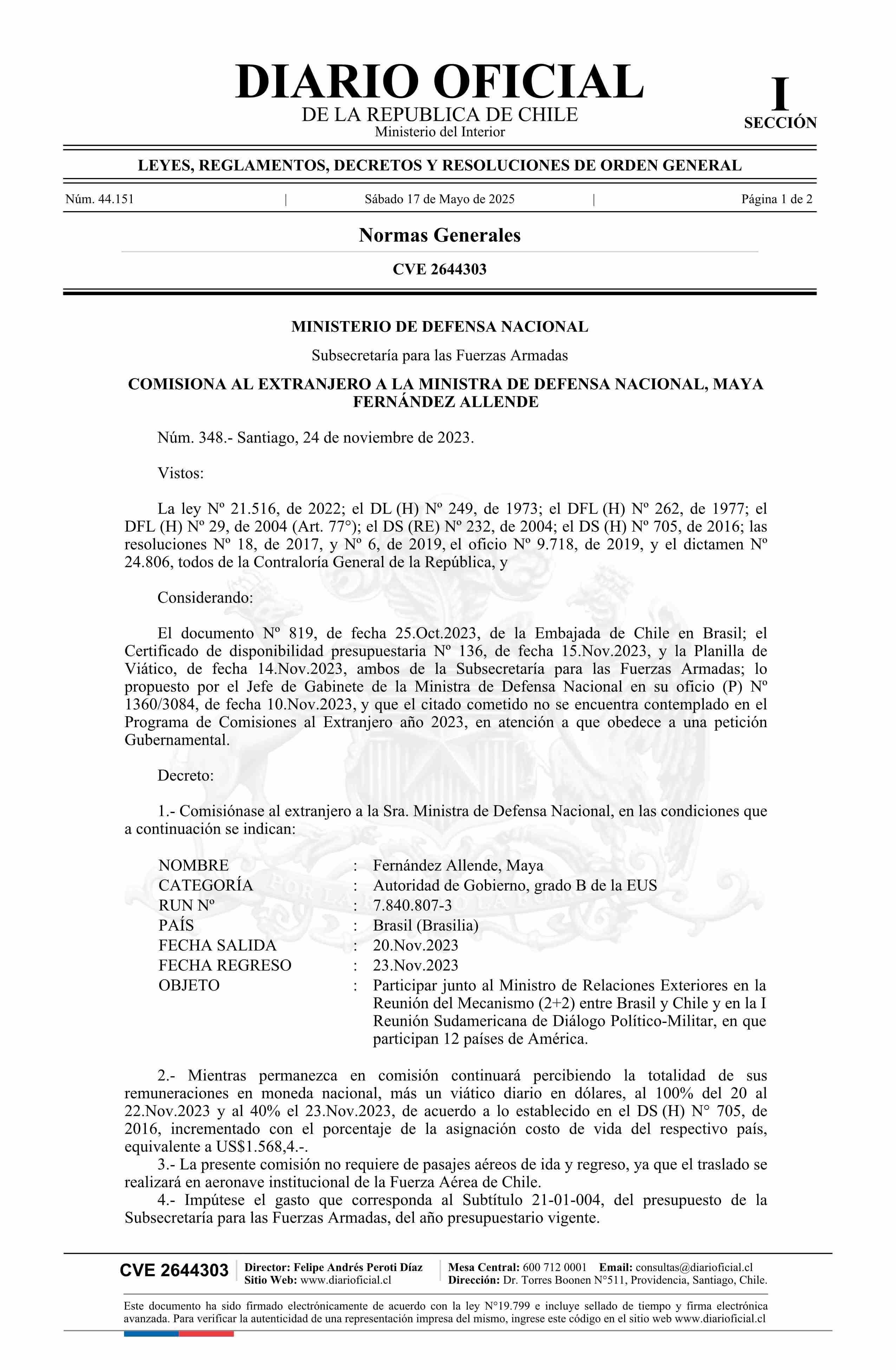 Decreto número 348, de 2023.- Comisiona a doña Maya Fernández Allende, Ministra de Defensa Nacional, a la ciudad de Brasilia, Brasil 17-05-2025 Diario Oficial Edición Electrónica |