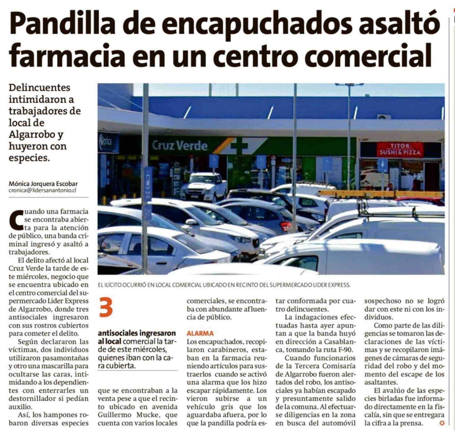 | Título: | Pandilla de encapuchados asaltó farmacia en un centro comercial |
