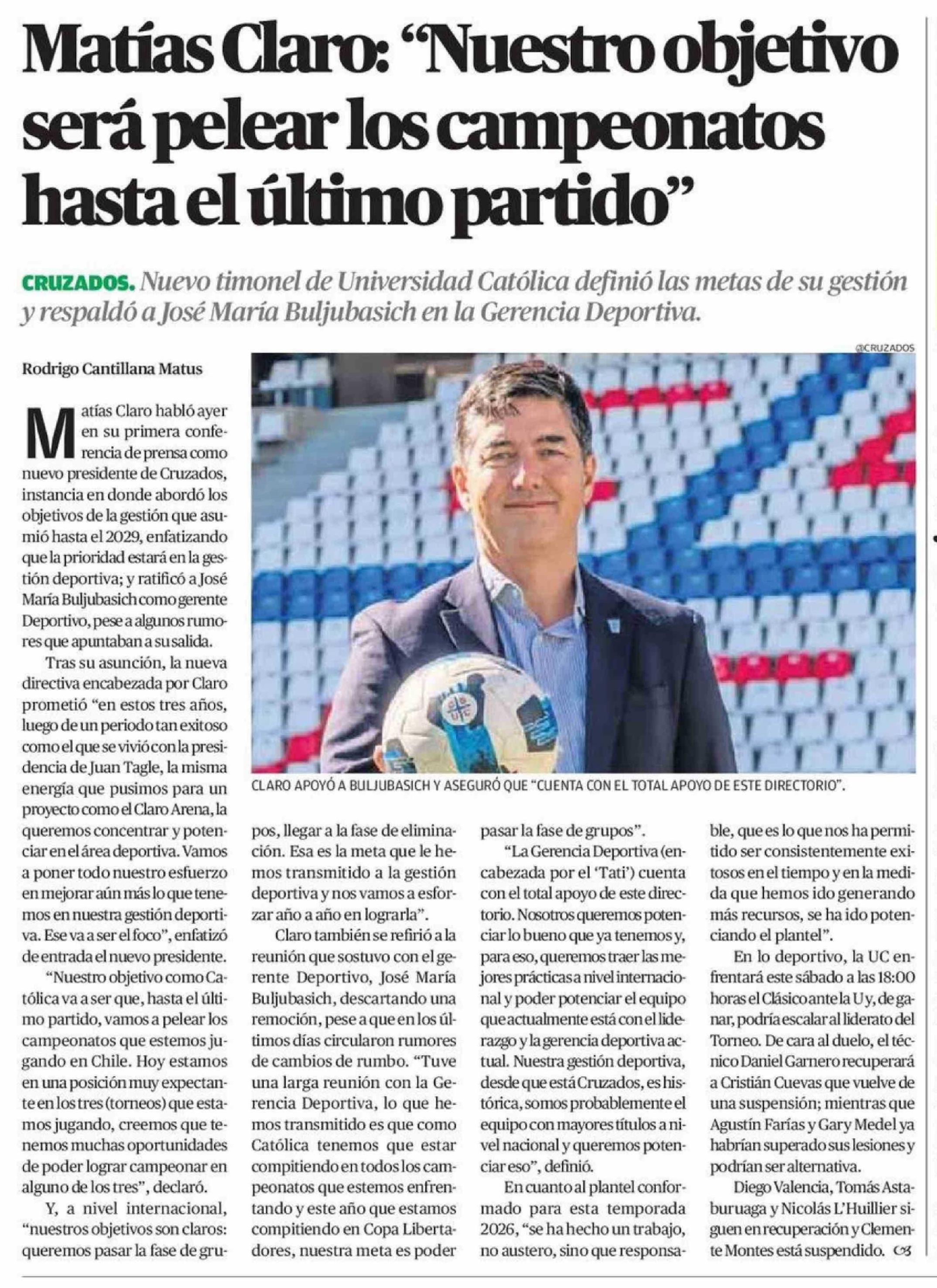 Matías Claro: "Nuestro objetivo será pelear los campeonatos hasta el último partido" 23-04-2026 El Mercurio de Calama |