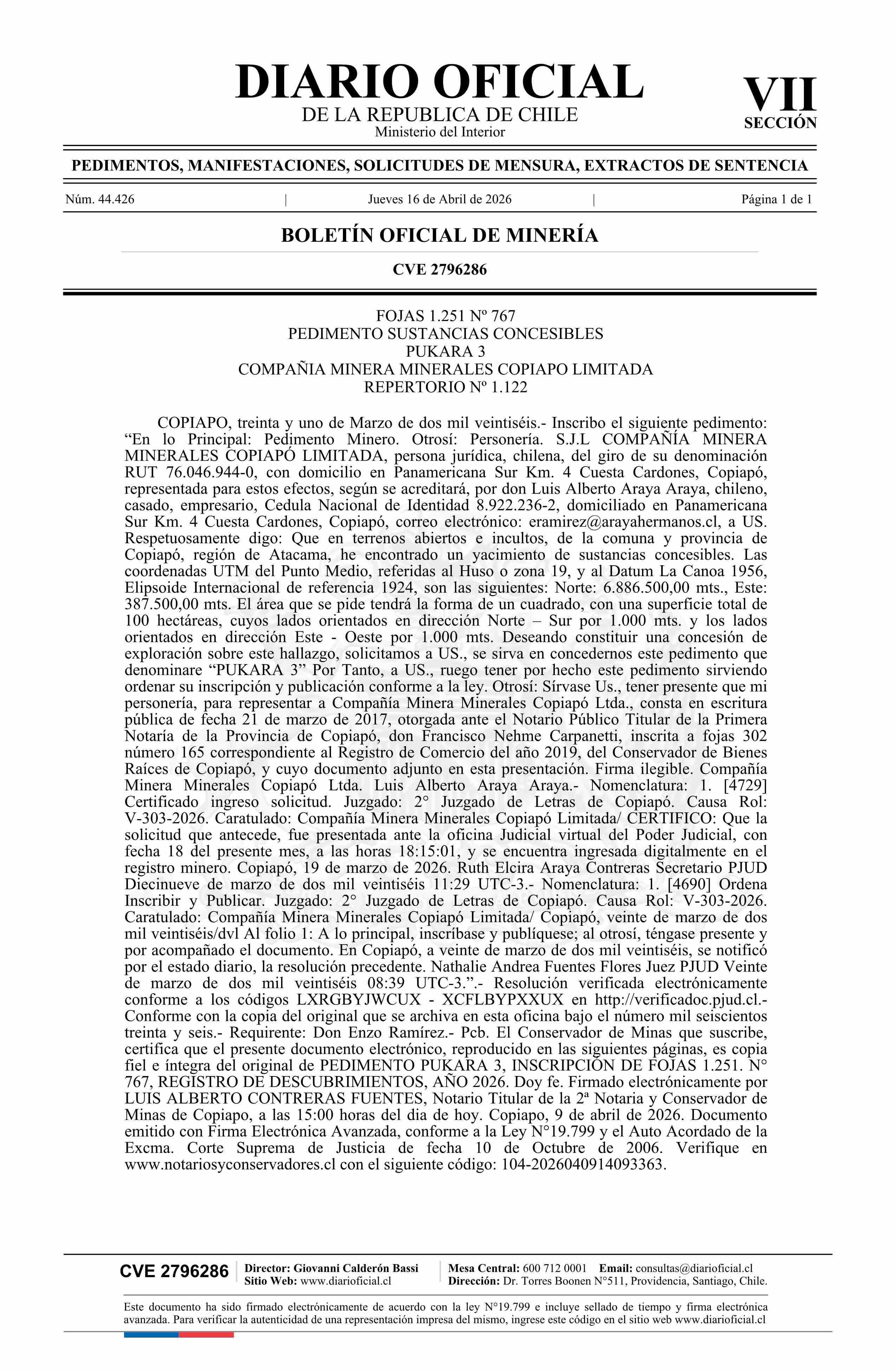 PUKARA 3 / Compañía Minera Minerales Copiapó Limitada 16-04-2026 DIARIO OFICIAL CHILE - BOLETÍN OFICIAL DE MINERÍA |