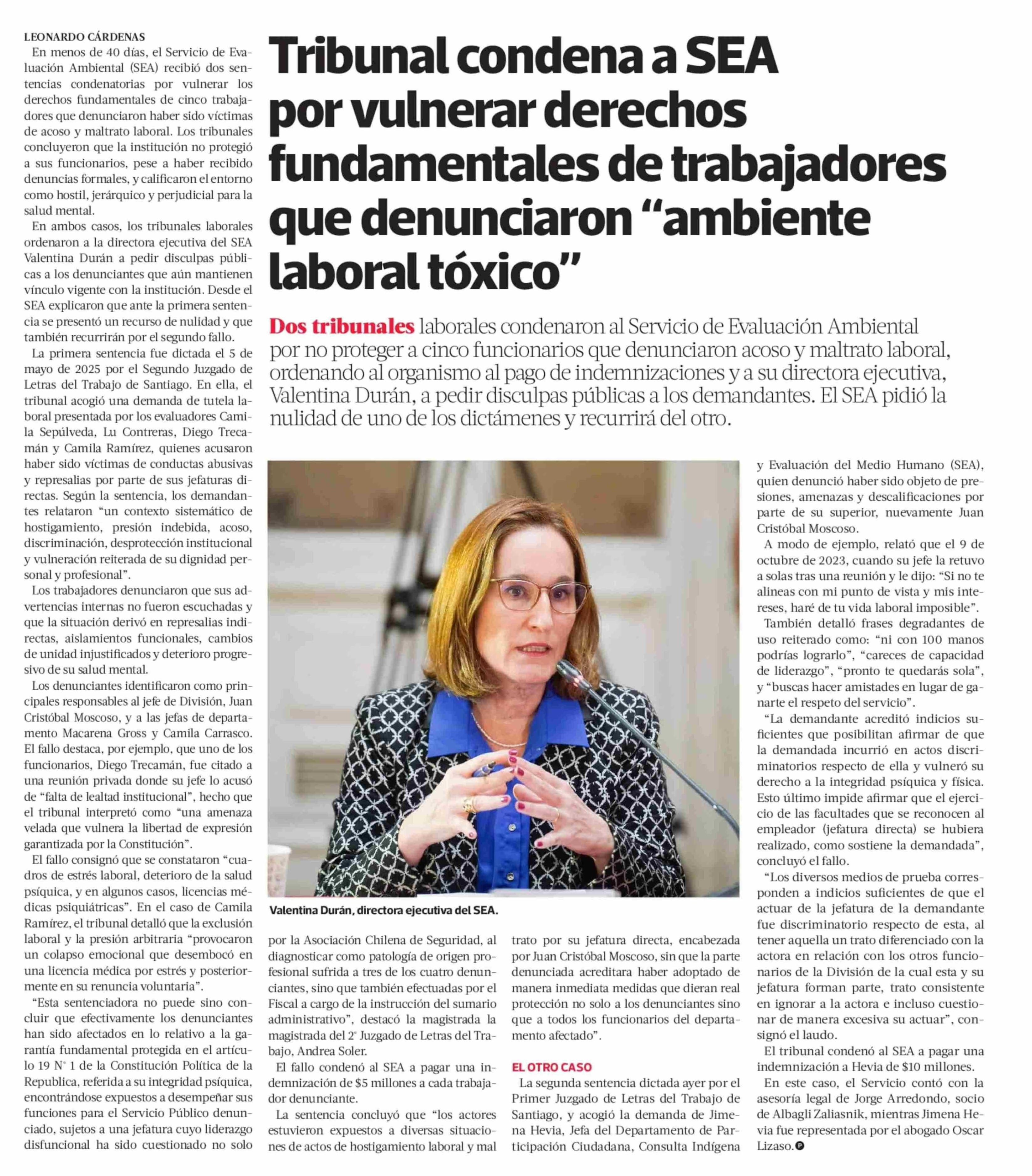 Tribunal condena a SEA por vulnerar derechos fundamentales de trabajadores que denunciaron “ambiente laboral tóxico” 11-06-2025 La Tercera |