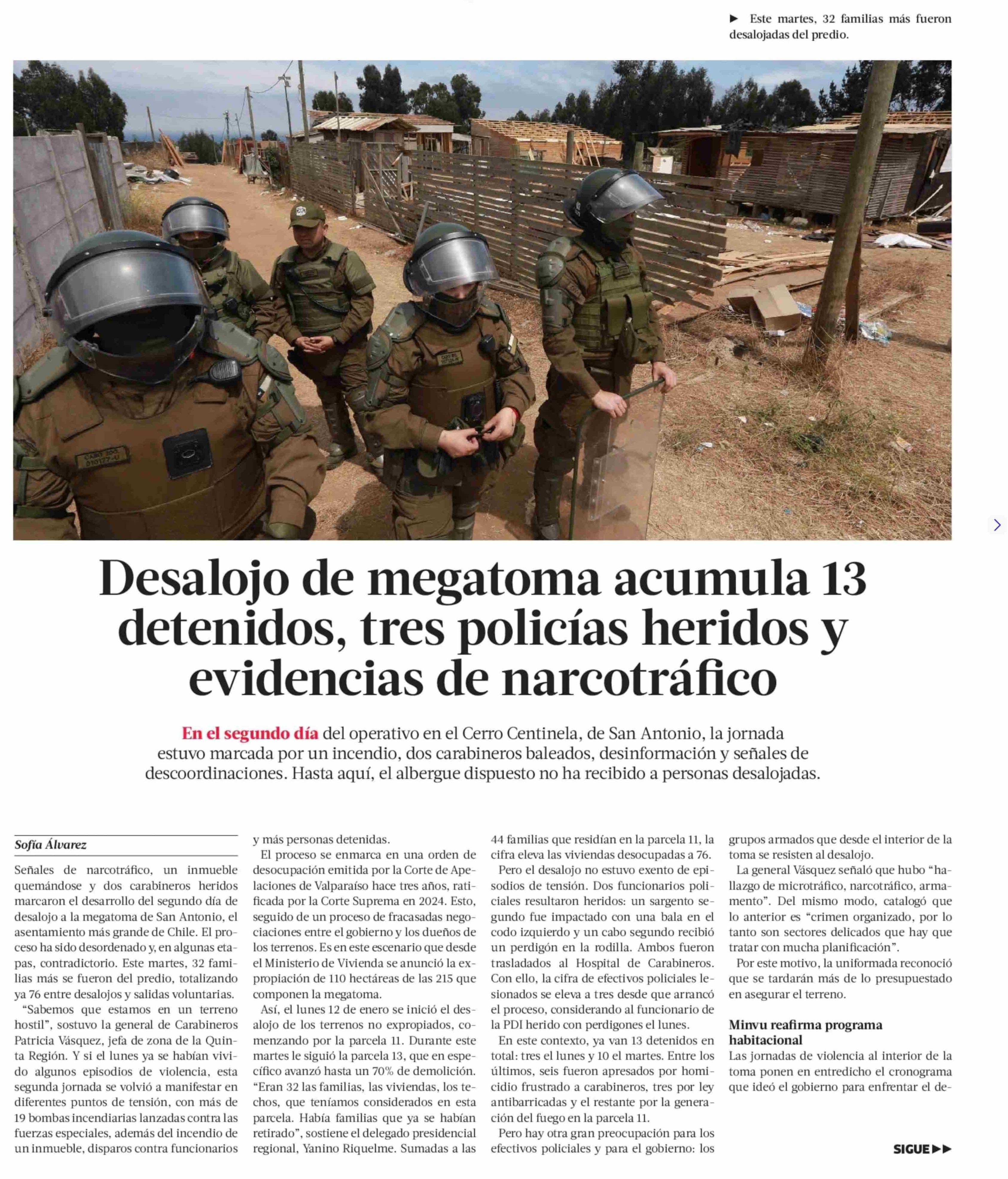 Desalojo de megatoma acumula 13 detenidos, tres policías heridos y evidencias de narcotráfico 14-01-2026 La Tercera |