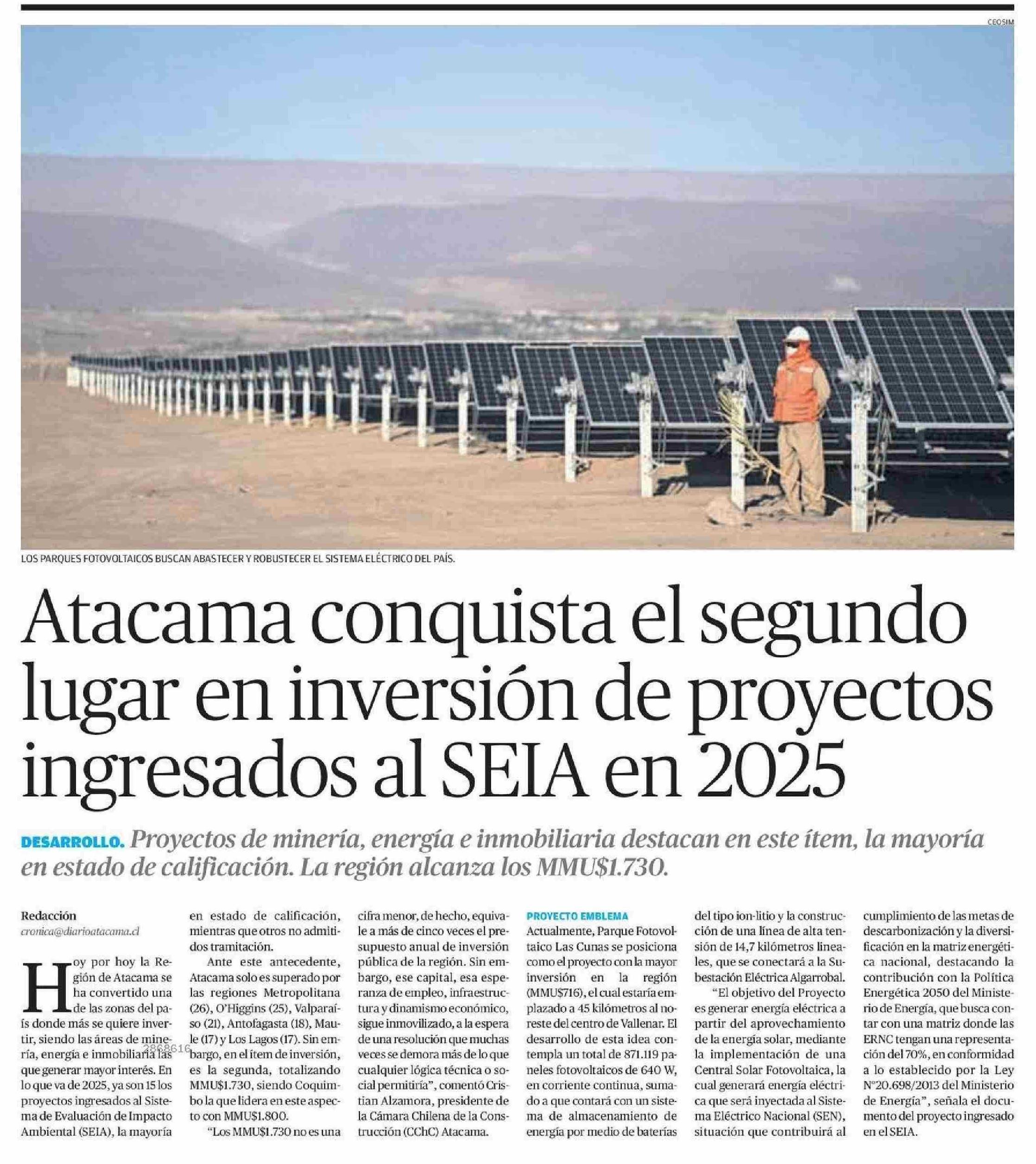 Atacama conquista el segundo lugar en inversión de proyectos ingresados al SEIA en 2025 21-06-2025 El Diario de Atacama |