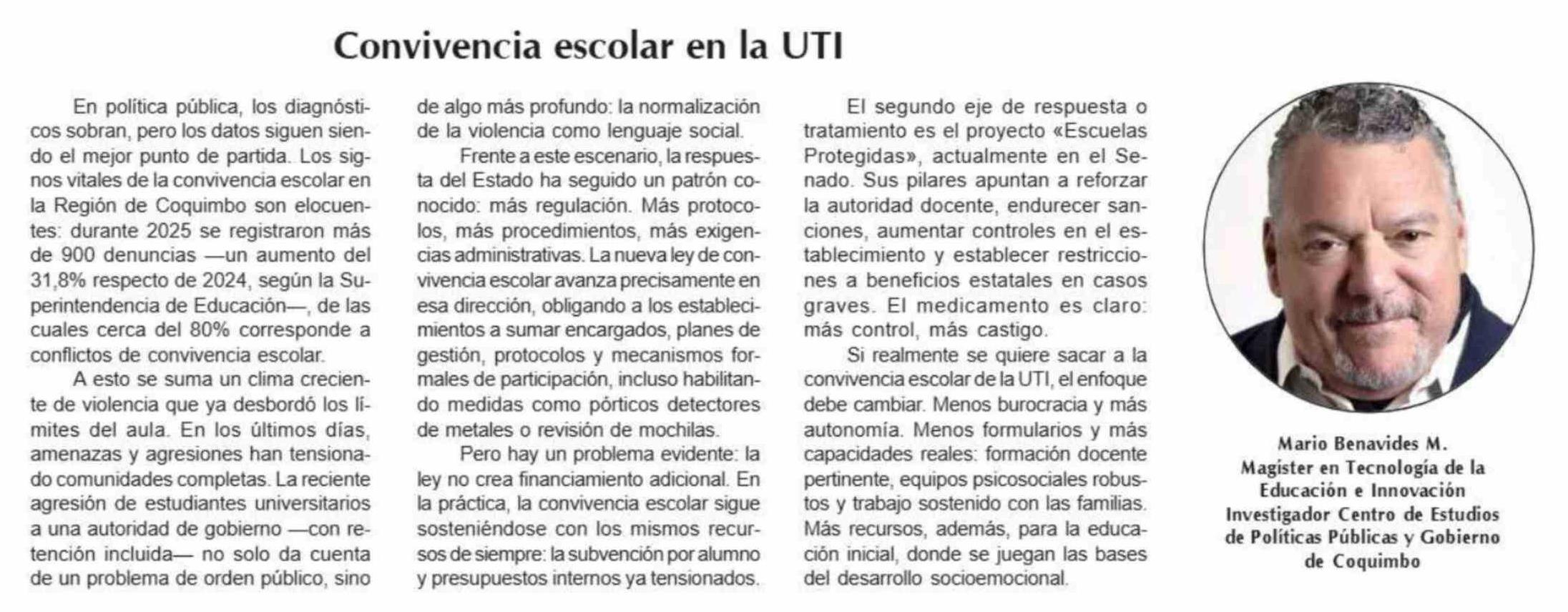 Columnas de Opinión: Convivencia escolar en la UTI 12-04-2026 Diario la Región |