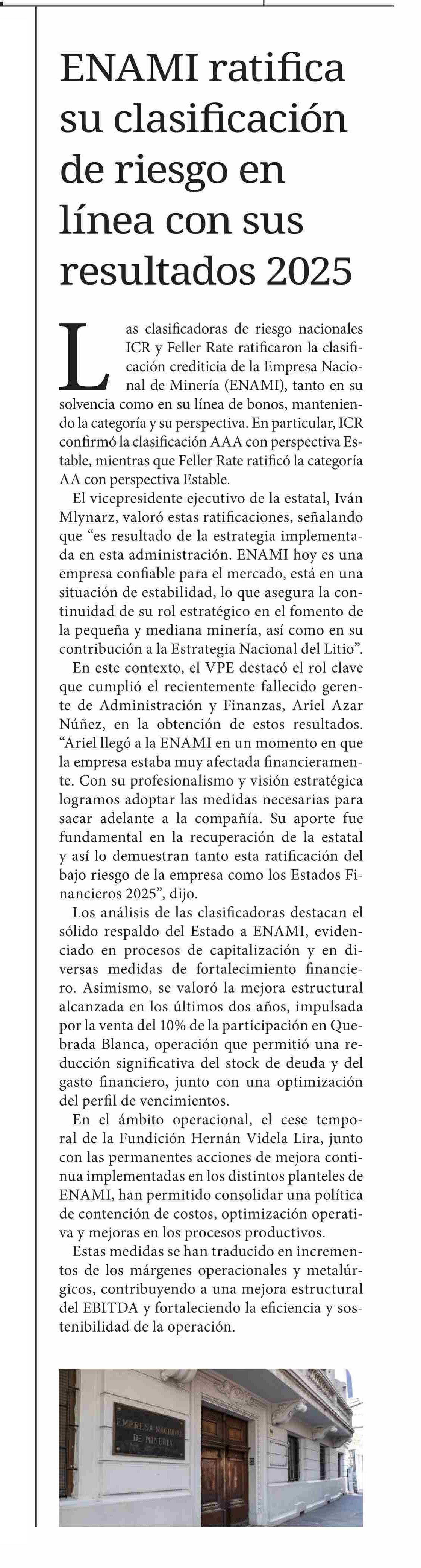 | Título: | ENAMI ratifica su clasificación de riesgo en línea con sus resultados 2025 |