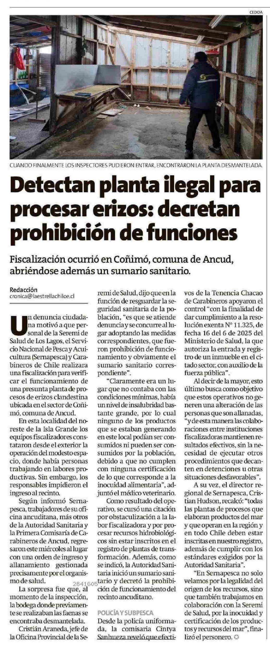 Detectan planta ilegal para procesar erizos: decretan prohibición de funciones 20-06-2025 La Estrella de Chiloé |