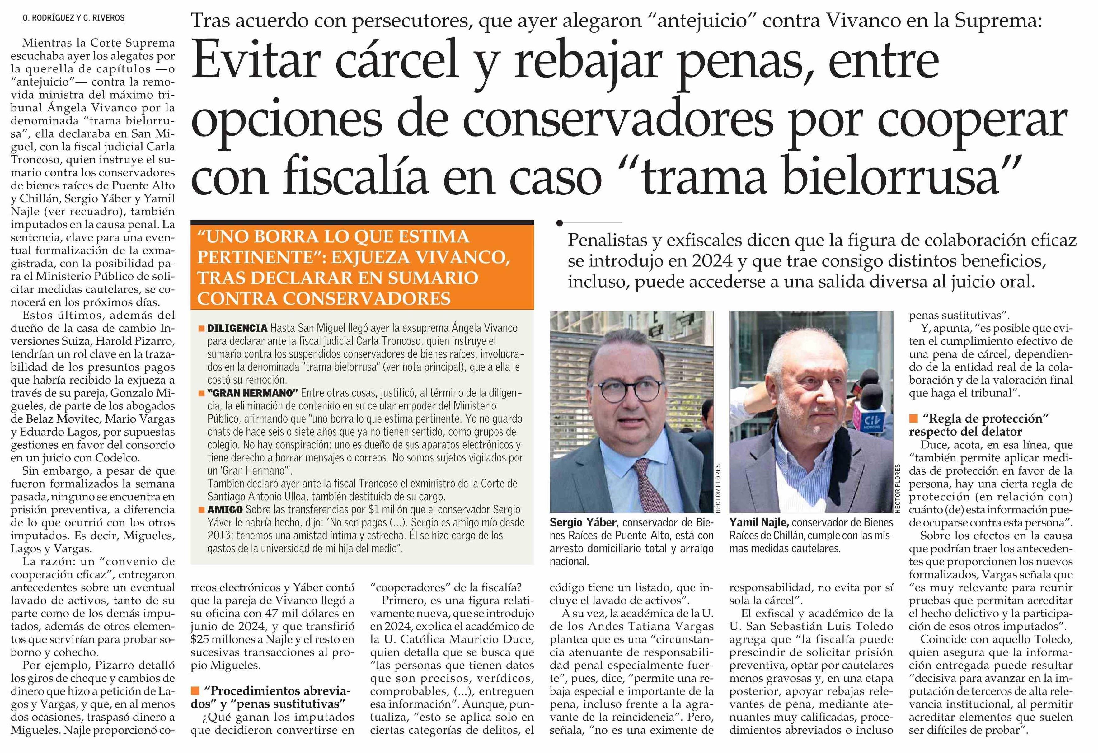 Evitar cárcel y rebajar penas, entre opciones de conservadores por cooperar con fiscalía en caso “trama bielorrusa” 21-01-2026 El Mercurio |
