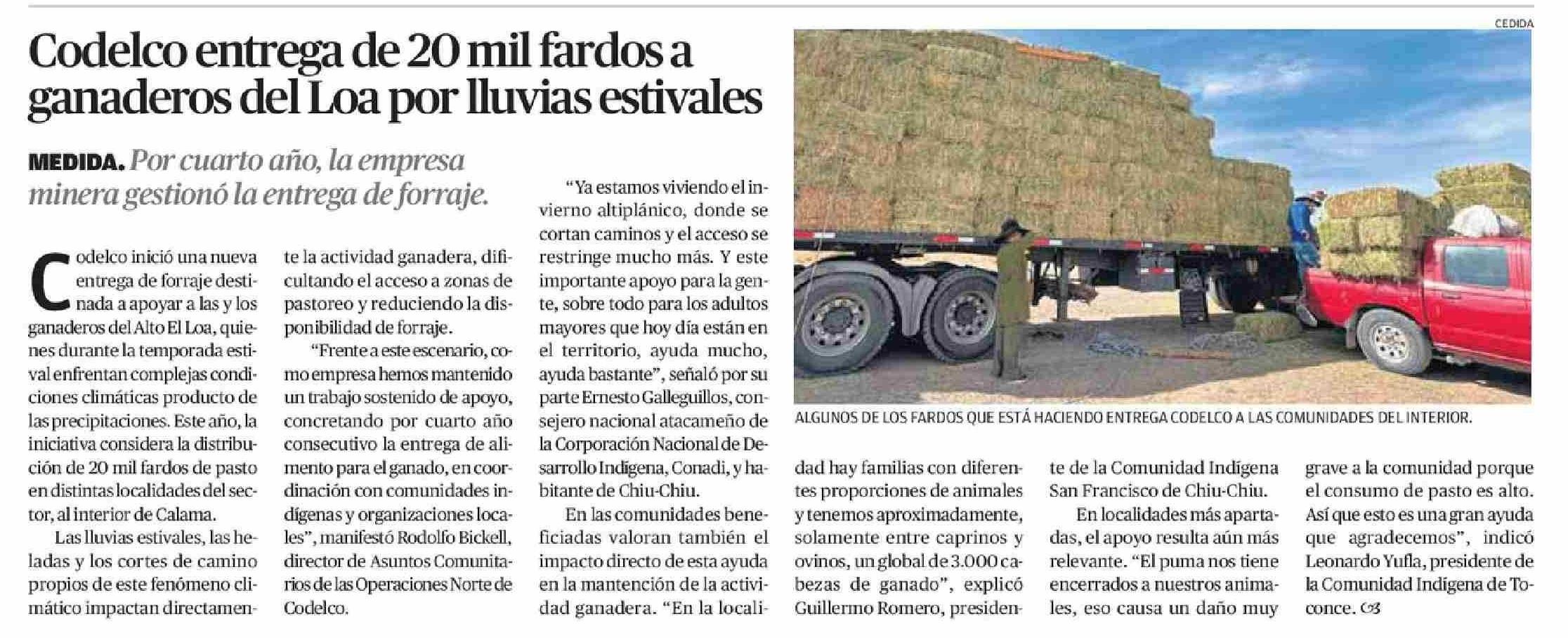 Título: Codelco entrega de 20 mil fardos a ganaderos del Loa por lluvias estivales