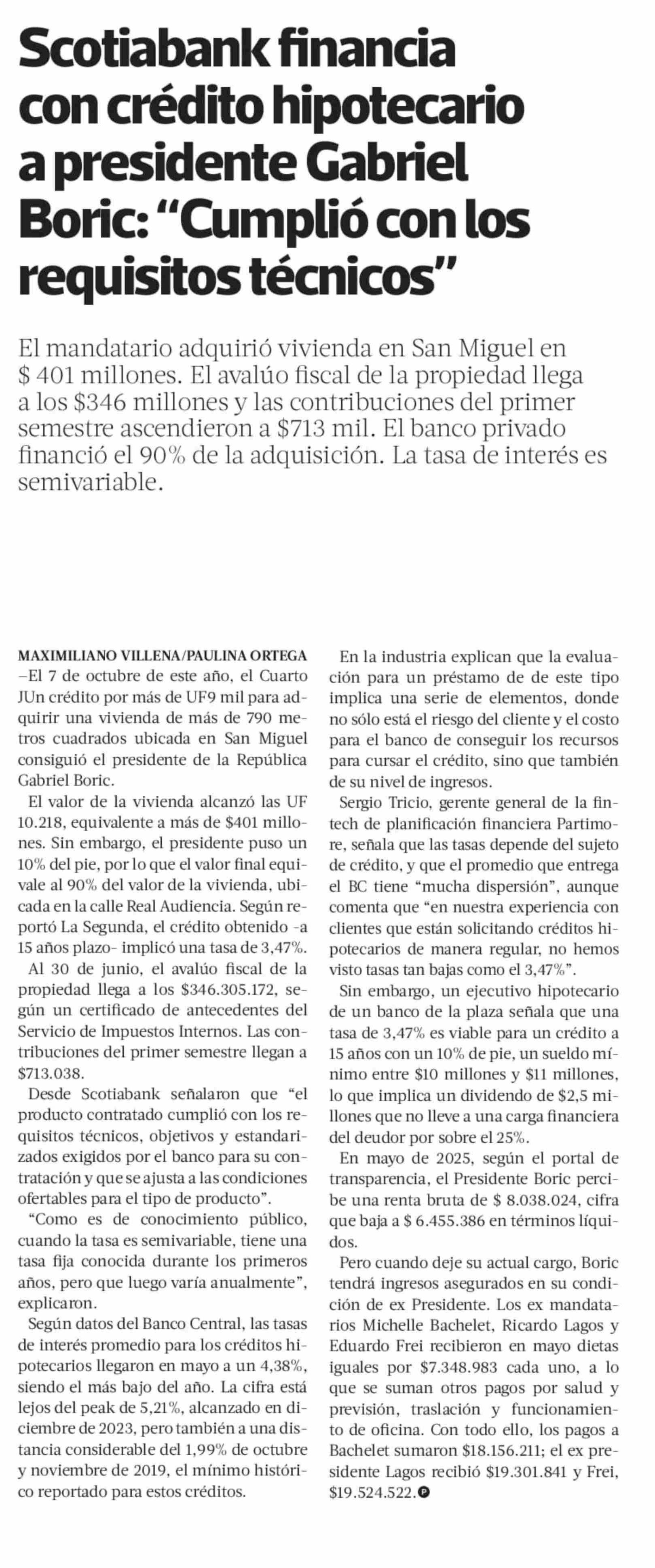 Scotiabank financia con crédito hipotecario a presidente Gabriel Boric: “Cumplió con los requisitos técnicos” 04-07-2025 La Tercera |