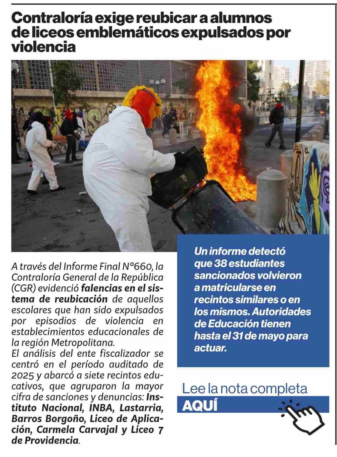 Contraloría exige reubicar a alumnos de liceos emblemáticos expulsados por violencia 24-04-2026 Puranoticia.cl |