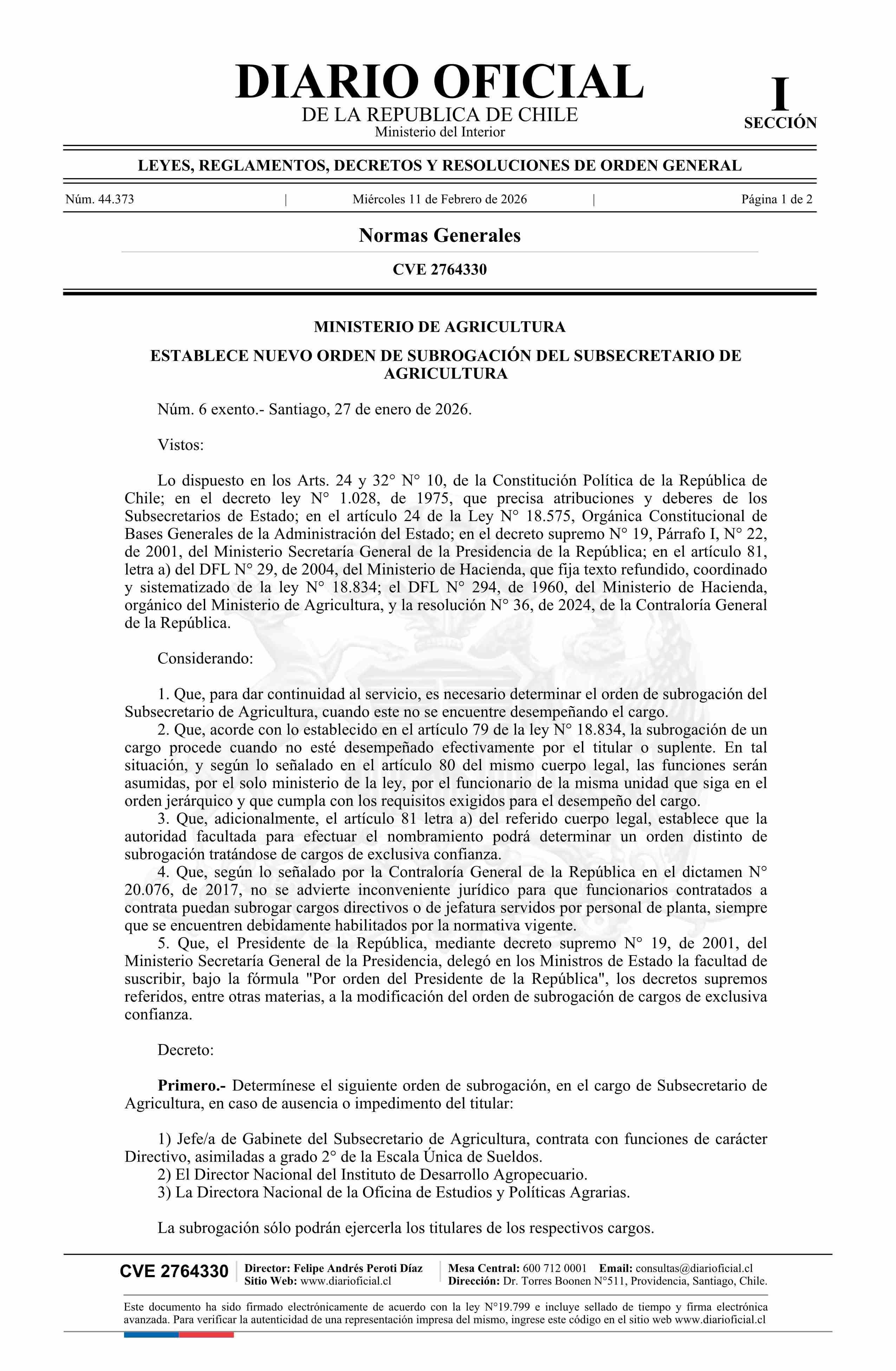 Decreto exento número 6, de 2026.- Establece nuevo orden de subrogación del Subsecretario de Agricultura 11-02-2026 Diario Oficial Edición Electrónica |