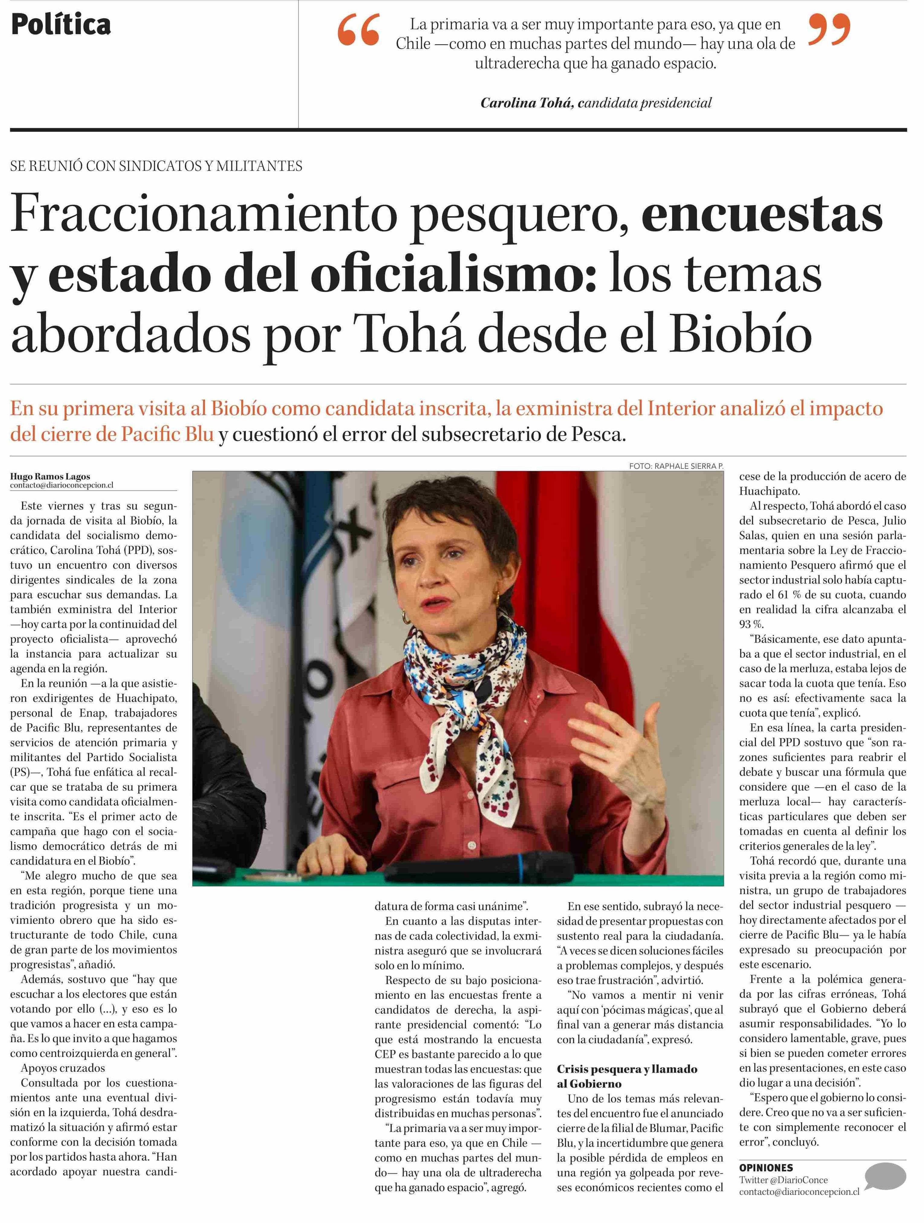 Fraccionamiento pesquero, encuestas y estado del oficialismo: los temas abordados por Tohá desde el Biobío 10-05-2025 Diario Concepción |