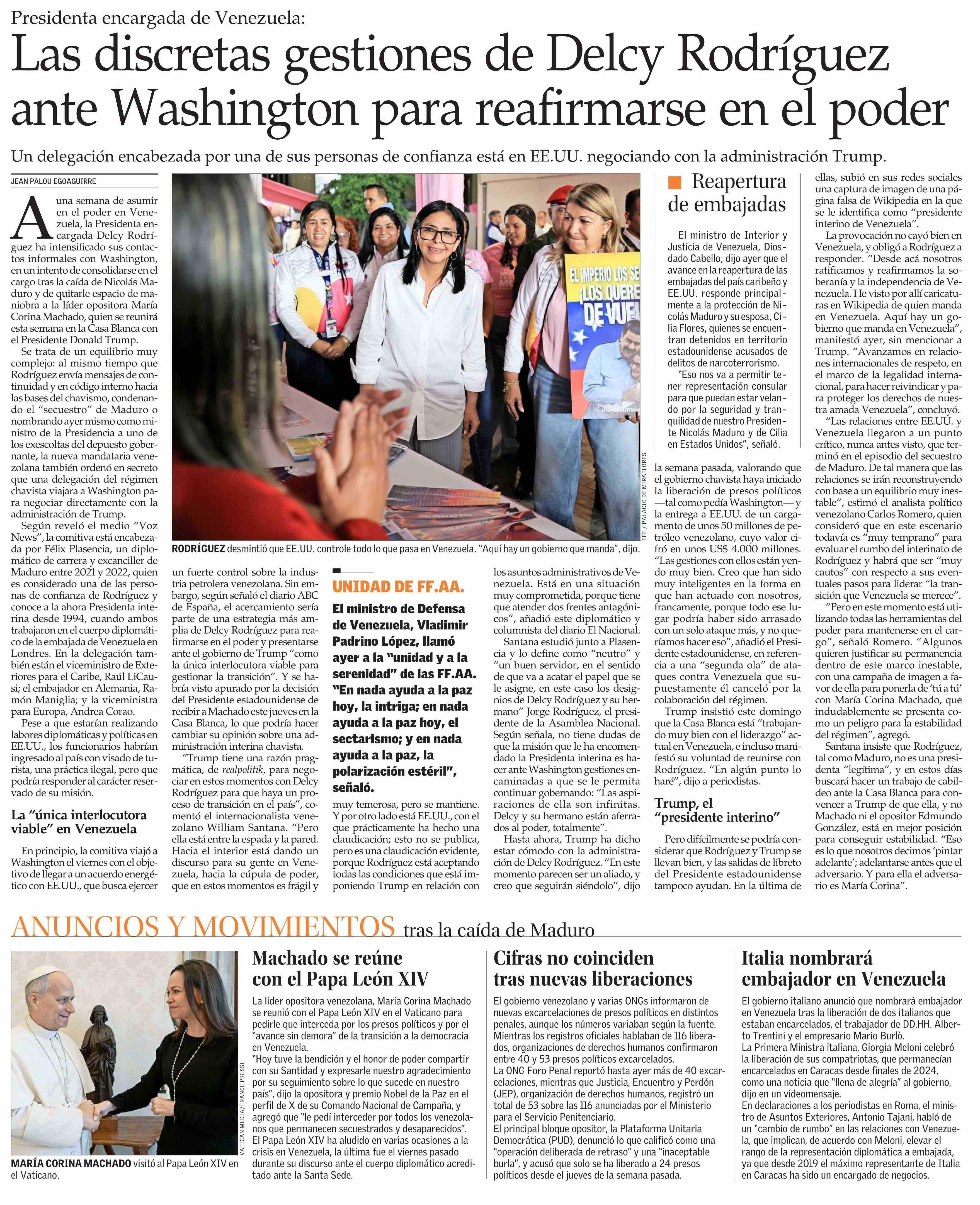 Las discretas gestiones de Delcy Rodríguez ante Washington para reafirmarse en el poder 13-01-2026 El Mercurio |