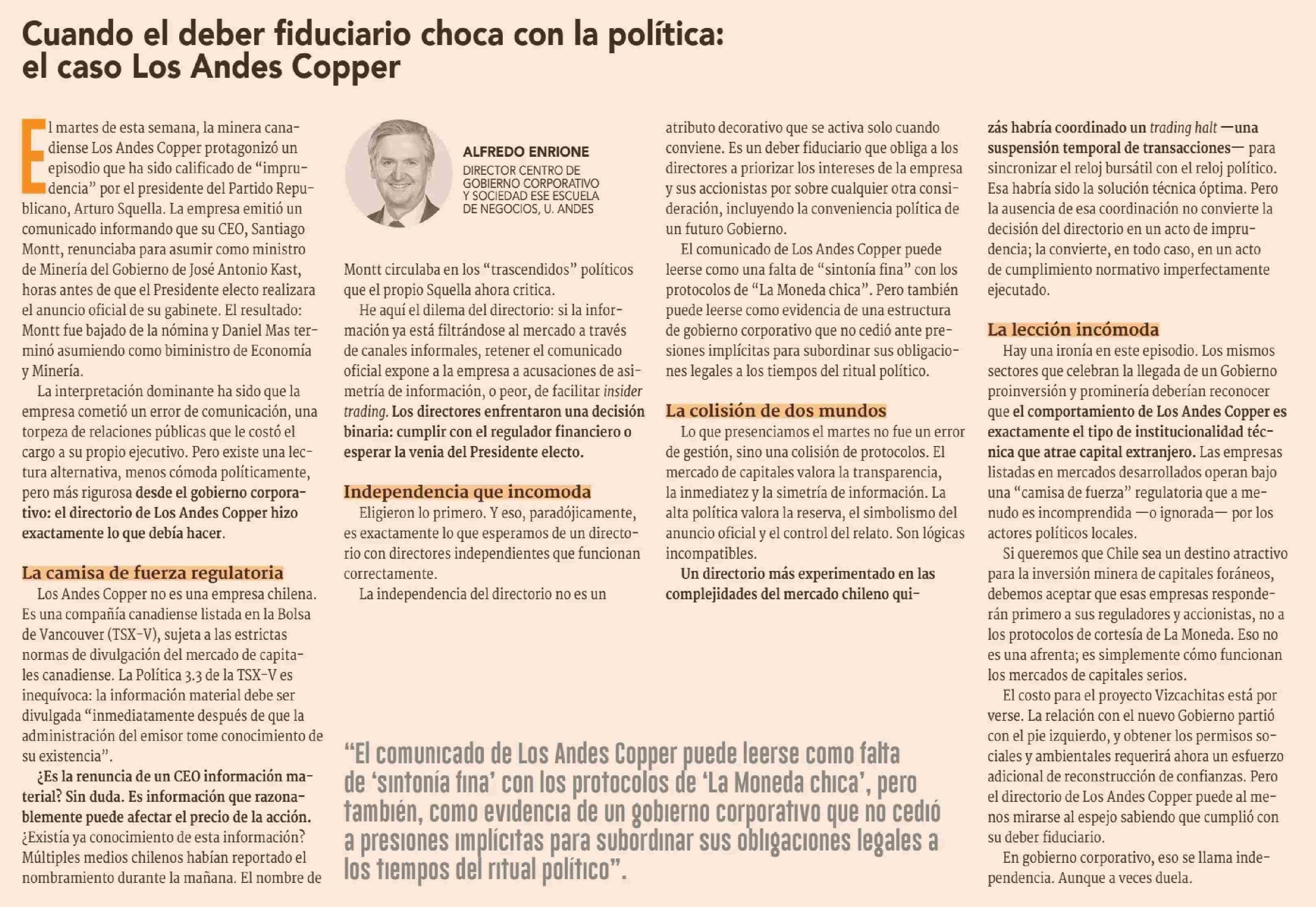 Columnas de Opinión: Cuando el deber fiduciario choca con la política: el caso Los Andes Copper 22-01-2026 Diario Financiero |