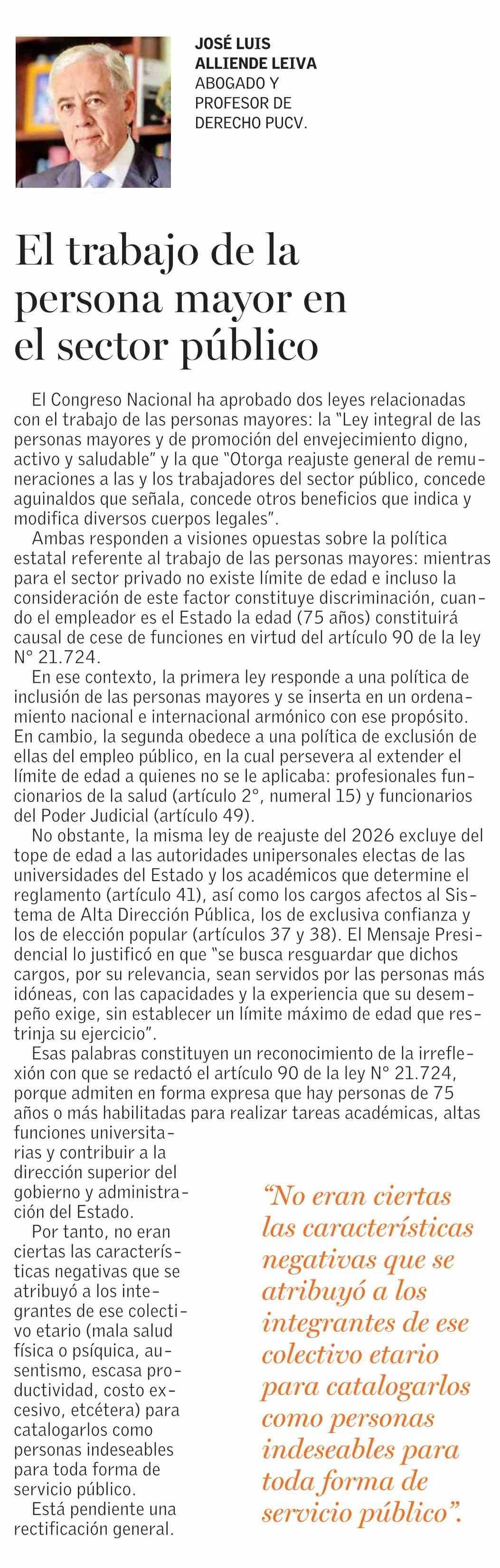 COLUMNAS DE OPINIÓN: El trabajo de la persona mayor en el sector público 09-02-2026 El Mercurio |