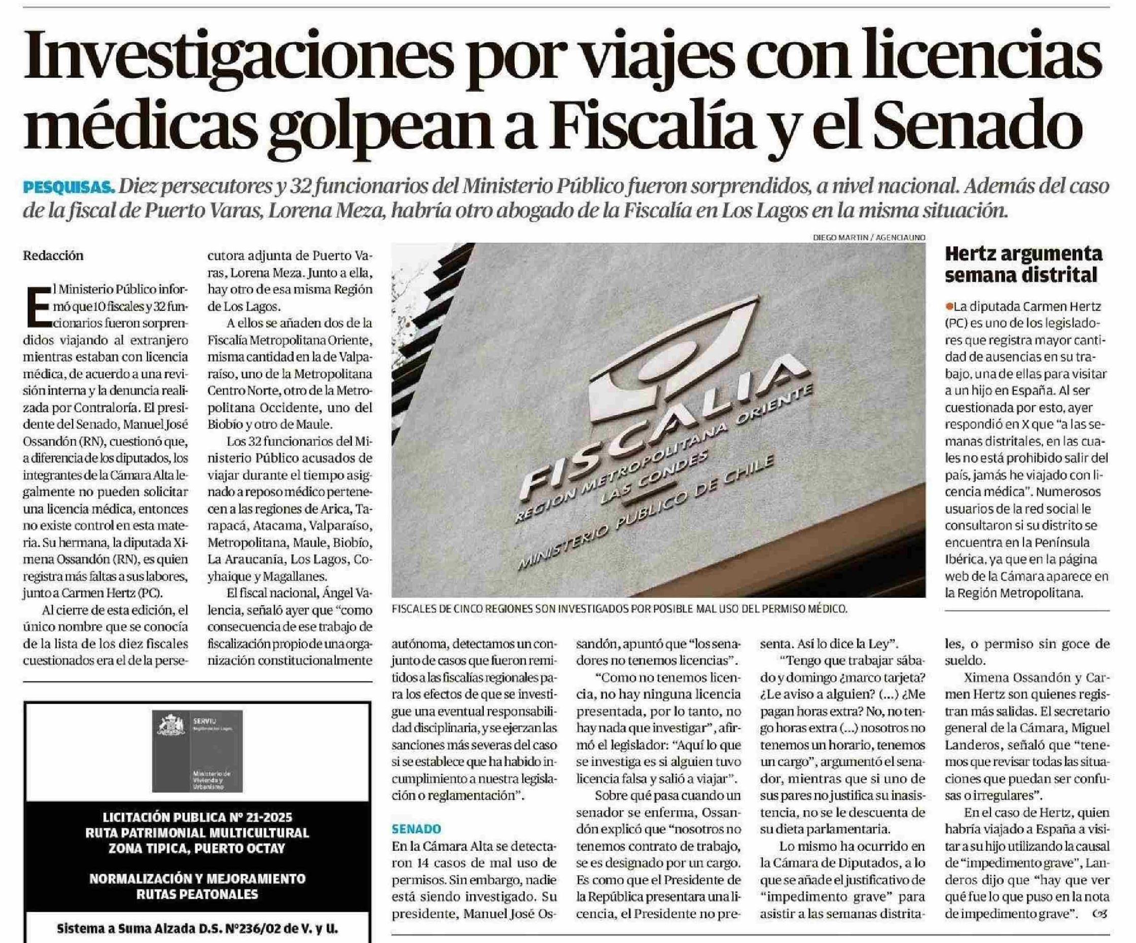 Investigaciones por viajes con licencias médicas golpean a Fiscalía y el Senado 13-06-2025 El Llanquihue |