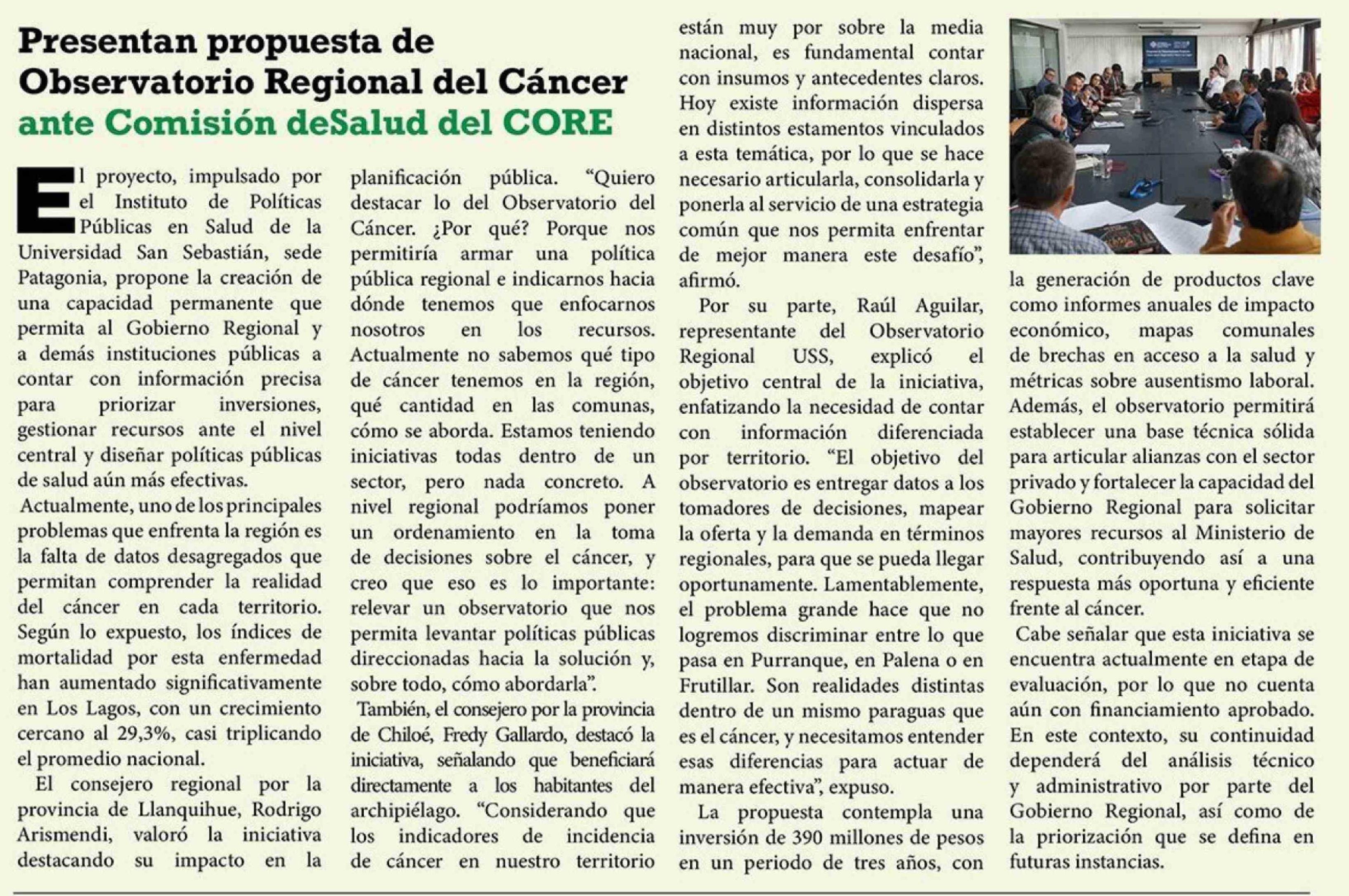 Presentan propuesta de Observatorio Regional del Cáncer ante Comisión deSalud del CORE 25-04-2026 El Heraldo Austral |