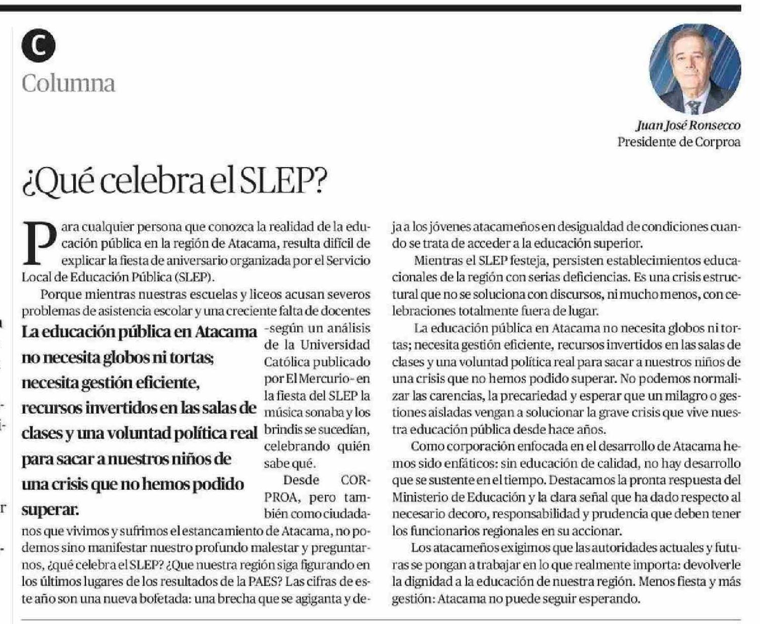 Columnas de Opinión: ¿Qué celebra el SLEP? 13-01-2026 El Diario de Atacama |