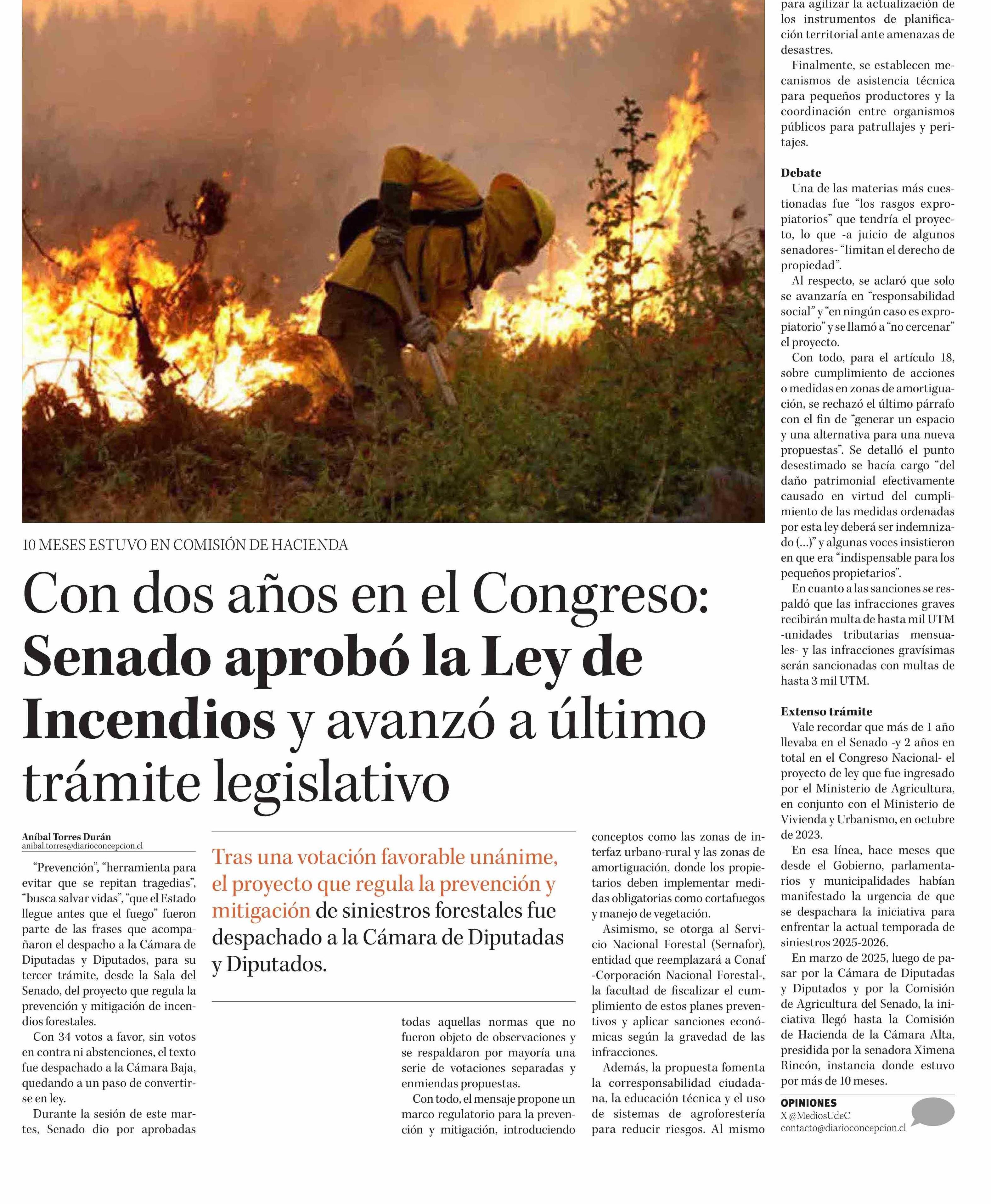 Con dos años en el Congreso: Senado aprobó la Ley de Incendios y avanzó a último trámite legislativo 28-01-2026 Diario Concepción |